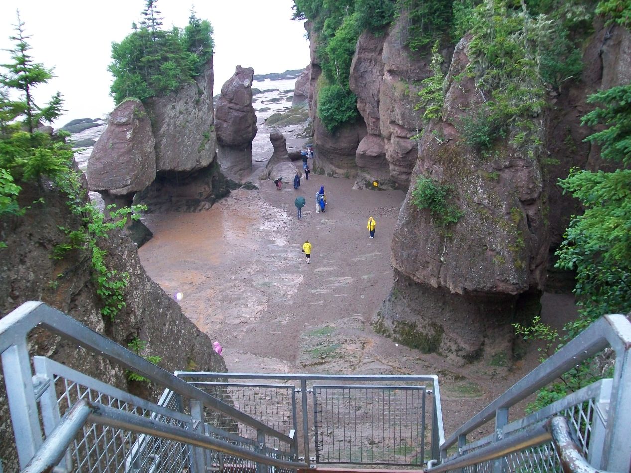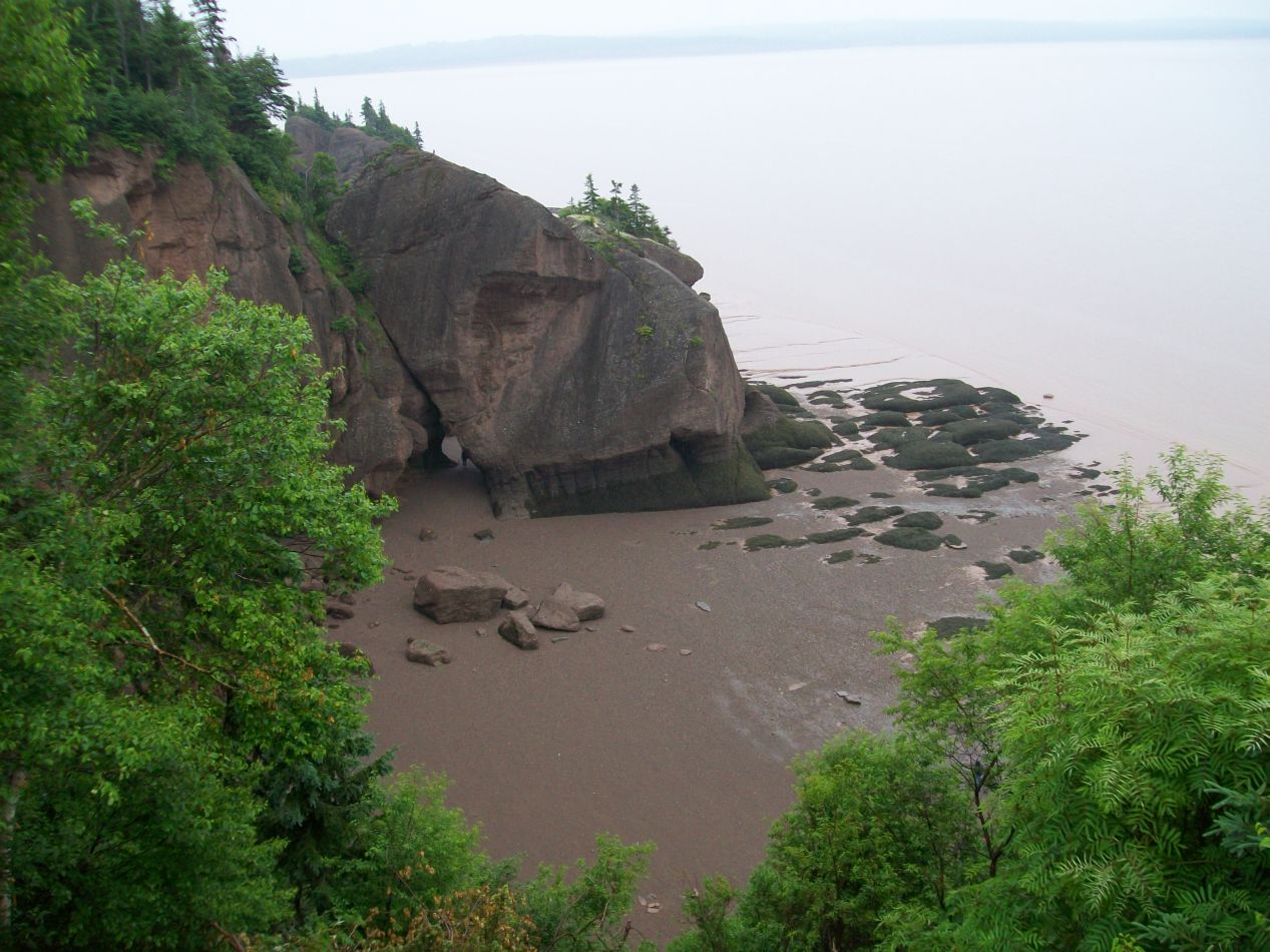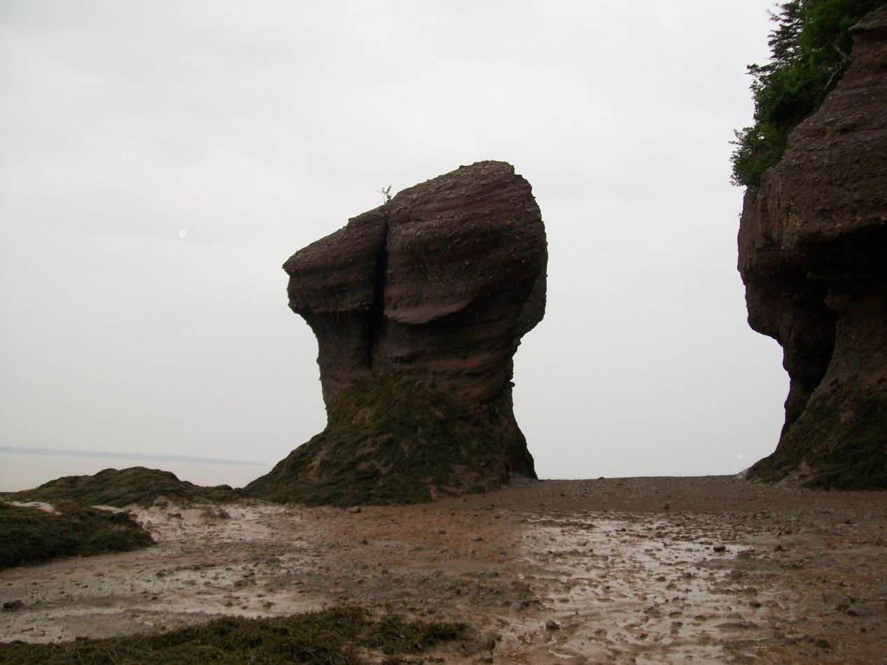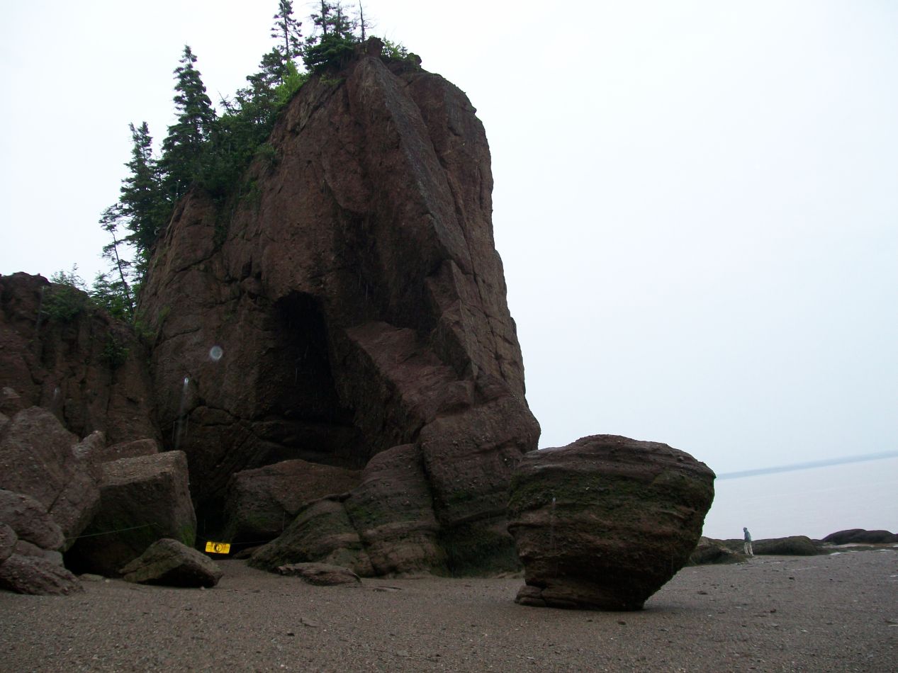 More pictures of the Hopewell Rocks. The southern end of the beach was the most open, perhaps because the cliffs were also higher in that area. The informational signs explained that the rocks along the coastline were mostly sedimentary conglomerate and sandstone rock, softer types of stone that are highly susceptible to being eaten away by water over time. The rock pillars are in the process of slowly collapsing due to erosion, and part of one of the Hopewell Rocks collapsed as recently as 2016, a few years after this visit.