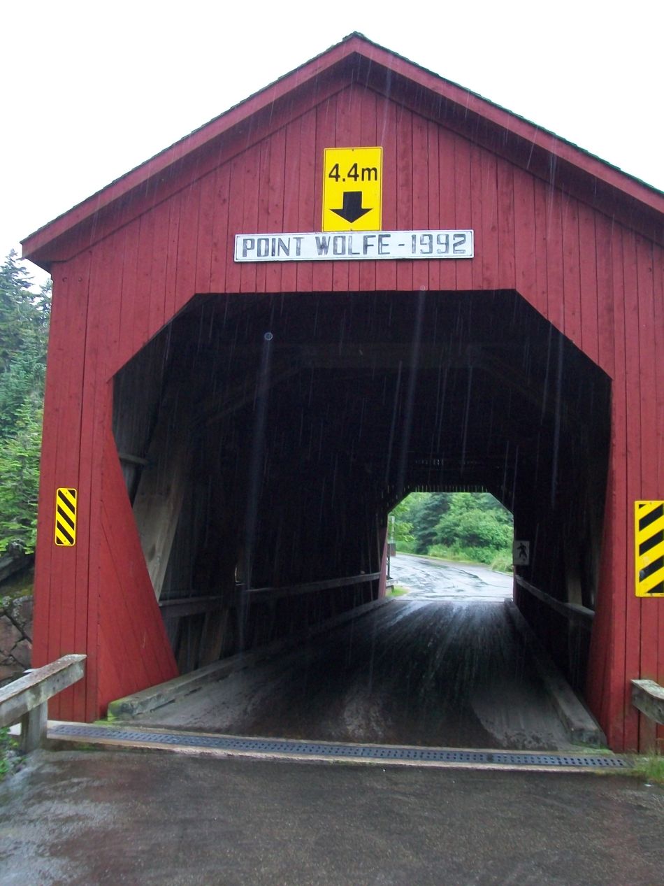 Now that I'd seen the Hopewell Rocks at near-low tide, I could return back to Fundy National Park to do some hiking. I drove through Alma once again and stopped to see the covered bridge at Point Wolfe. This bridge didn't appear to be historic judging by the 1992 date above its entrance, but it was situated in the middle of forested hills overlooking a river and had a well-chosen spot for photogenic images. I drove through the bridge in my car for fun and then drove back again since the covered bridge didn't take me in the correct direction. The rain was pouring down in torrents now, making it difficult to drive at all. Fortunately there was almost no one else on the road on this very wet day.