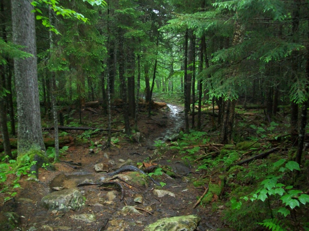 I made my way back to the Third Vault Falls trail and set off on the roughly five mile roundtrip walk. It was more than a little bit crazy to be doing this hike with the weather in such terrible shape, and I had serious regrets when I found myself soaked to the bone. Still, what else could I do if I wanted to see the falls? I only had a single day to spend in the area and it was unlikely that I'd ever be coming back this way again. This was my one and only chance, and I felt that I had to take it. The heavy rain had turned the hiking path into a soggy mess, and the downhill course basically became a small river as I continued to descend. Eventually I reached the Upper Vault Brook where the path just kind of turned into the waterway itself, which I followed as it continued to run downhill. The trail was practically bursting with plant life, and everything seemed to be different shades of green. This is an area that gets a lot of rainfall and it felt a bit like being in a temperate rainforest. The whole experience would have been amazing without the drenching rain.