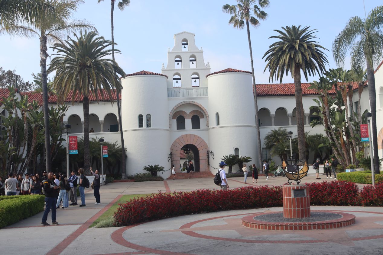 I wandered a bit further to the west and found myself in an open area named Campanile Mall looking towards Hepner Hall. This was a very pretty part of the campus and the design of this academic hall had to have been inspired by the nearby San Diego de Alcalá; that sequence of bells (which were chiming the hour for 5:00 PM as I passed) looked so similar that it couldn't have been a coincidence. Further to the west were the athletics fields and Viejas Arena where the university's basketball teams play. I took a quick look at these facilities and then looped around to start heading back towards where I had parked. One thing missing from the SDSU campus was much in the way of residence halls: there's apparently only room for about 4000 students to live on campus which means that something like 85 percent of the students are commuters. No wonder parking was so tough for me to find! This should be a clue that San Diego State caters mostly to middle class families and not the wealthy; rich Californians send their kids to Stanford or Cal Berkeley or UCLA. Thus you won't find a lot of politicians or businessmen among the list of famous SDSU alumni; names that I picked out from the university website were people like actor Gregory Peck and athletes Tony Gwynn and Marshall Faulk. Overall, I had good impressions of the rather small campus and I'm glad that SDSU provides educational opportunities to students from traditionally disadvantaged groups.