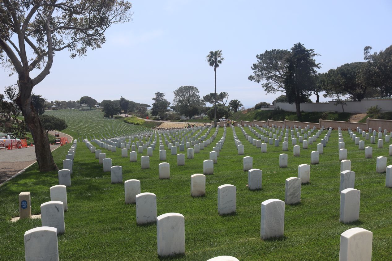 I made one unplanned stop as I began the drive back from Point Loma. I had seen huge numbers of tombstones while driving down to Cabrillo National Monument and realized that this had to be a military cemetery. Sure enough, I read signs indicating that this was Fort Rosecrans National Cemetery and stopped to take a few pictures before returning to San Diego proper. This cemetery dates back to the late 19th century and became a national cemetary in 1934; there are about 120,000 former US service members and their families buried here. There are about two dozen recipients of the Medal of Honor buried here as well as a number of memorials to ships that were sunk while on duty. The location was simply beautiful, with the grave sites running along a series of hills looking out over either San Diego Bay or the Pacific Ocean. I can think of few places better to be buried and a lot of places that would be worse.