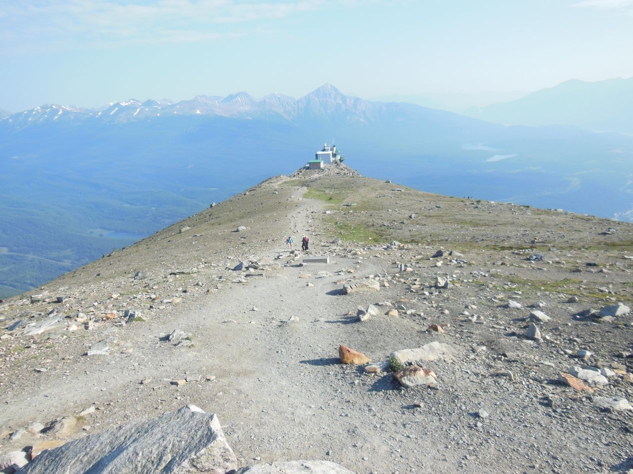 The Jasper Skytram deposited its visitors up near the top of the mountain. This was not the pinnacle of Whistlers Mountain, however, and the peak was accessible via a short path known as the Whistlers Summit Trail. It was only 1.4 kilometers in length, less than a mile, but comprised a 200 meter elevation gain along the way. I quickly found that this was a strenuous trail to hike upwards, and the other passengers on the gondola, mostly families with children, fell behind me in short order. This trail was well above the tree line and the harsh conditions made it impossible for almost anything to grow. Only the very toughest scrub grasses grew here, clinging to life on the exposed mountain face. I also saw a tiny chipmunk at one point, whose gray-colored fur blended into the rocks and made it difficult to see. Mostly though, this was a path of gravel and rocks. A steep path of gravel and rocks. I'm not sure if the pictures convey this properly, but it was a tough haul for such a short trail.