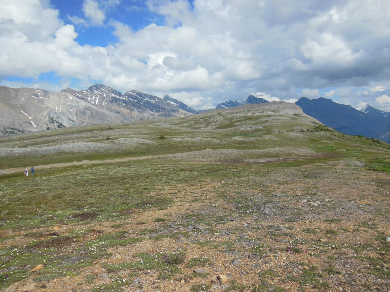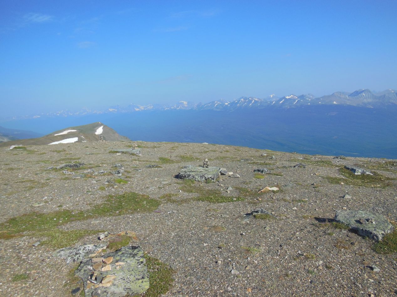 Once I made it to the top of Parker Ridge, the trail flattened out considerably. In fact, it was difficult to spot the trail at all up at the summit because there were no distinguishing landmarks. I had gone above the tree line again with the landscape reduced to tough scrub grass in the midst of otherwise bare rock. This produced a mixture of green and gray terrain that I've only ever seen in alpine regions. The views were outstanding though, and the clear weather allowed me to see for miles in every direction. Mountains, mountains, and more mountains were the story in this area. At the very end of the trail I was able to spot the Saskatchewan Glacier off in the distance, located down below in the valley between two ridges of peaks. It was hard to see from this far away, and since I had just left another glacier, I didn't feel the need to get any closer.