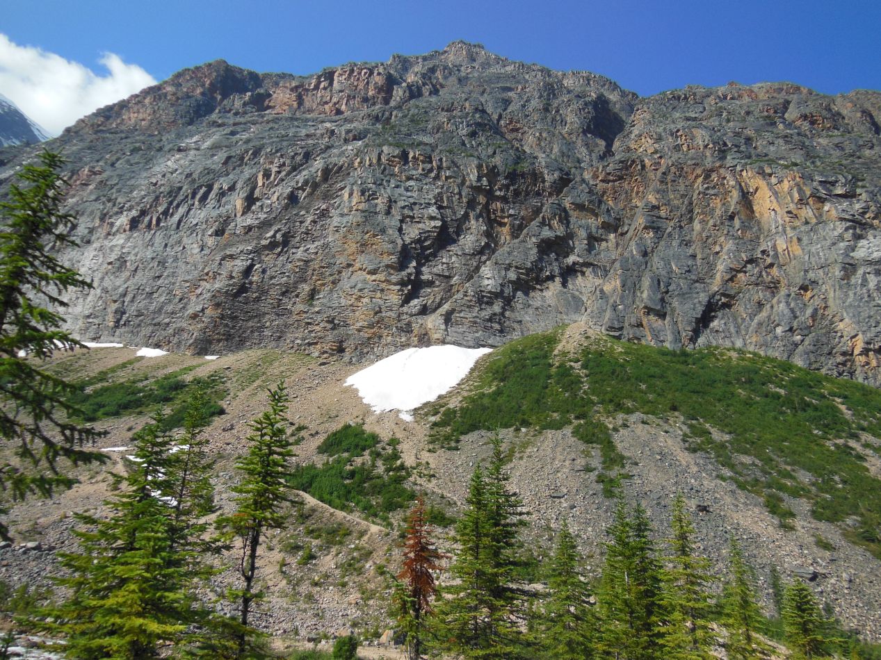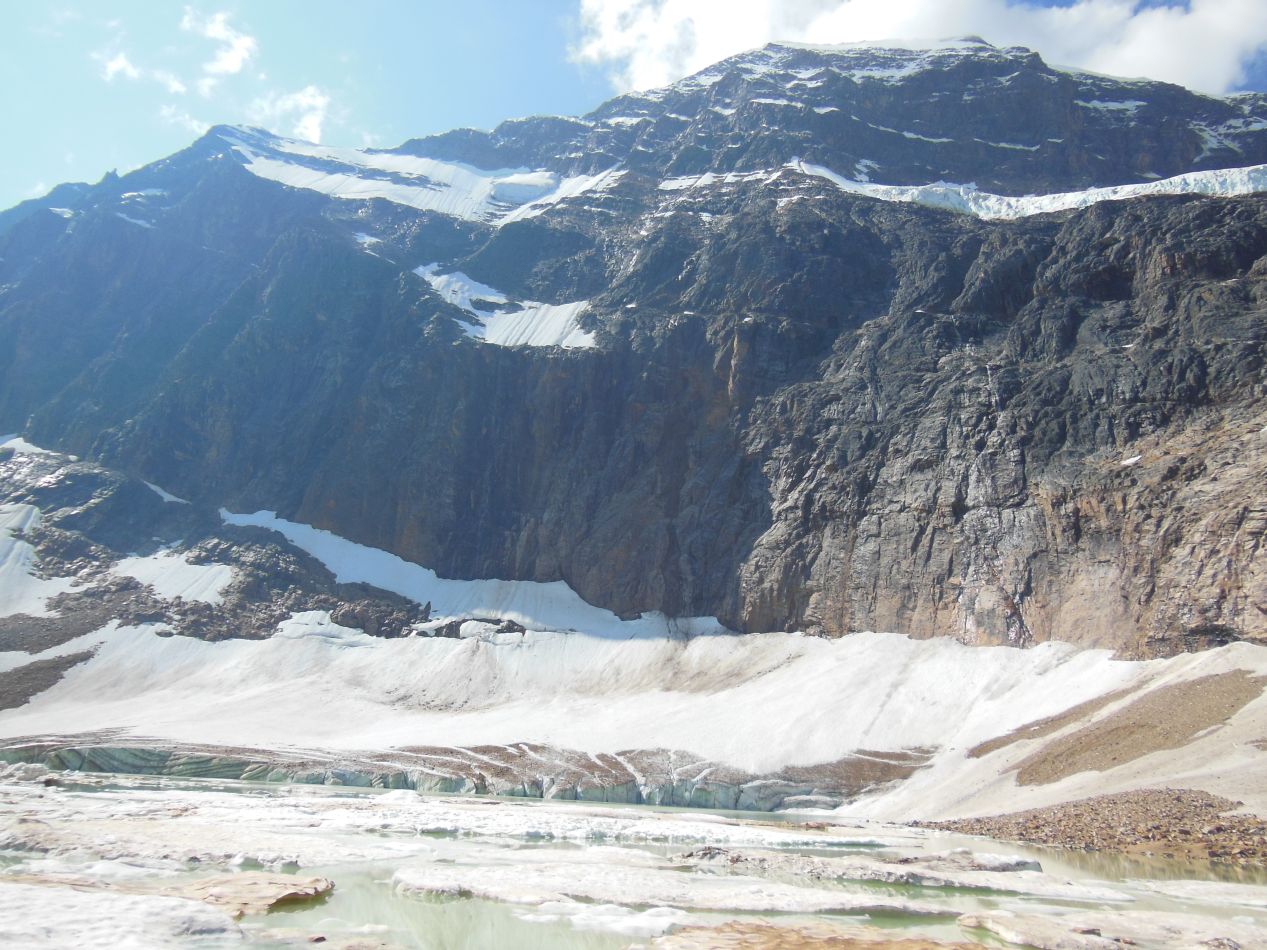 The base of the mountain held a pool formed by glacier runoff. This was where the Cavell Glacier was located, or at least what was left of it. There didn't seem to be too much of it remaining, only a small amount of snow and ice tucked up against the shadow of the overhanging mountain. Angel Glacier, the one situated up above the pool on the overhanging rocks, appeared to be in better shape. It was the middle of the summer of course, and this was the part of the year where the glaciers would be at the minimum extent. I was still nonetheless disturbed to see how reduced in size they were, especially when compared to pictures from the same locations taken 20, 50, and 100 years earlier. Cavell Pond was the name of the little body of water formed by melting glacier runoff, and it was an unattractive spectacle to say the least. Glaciers are surprisingly dirty when seen close up, full of gravel and sand that they pick up along the way when moving. There was a warning sign here telling visitors not to drink the water or swim in it, and I don't think there was much risk of either one.
