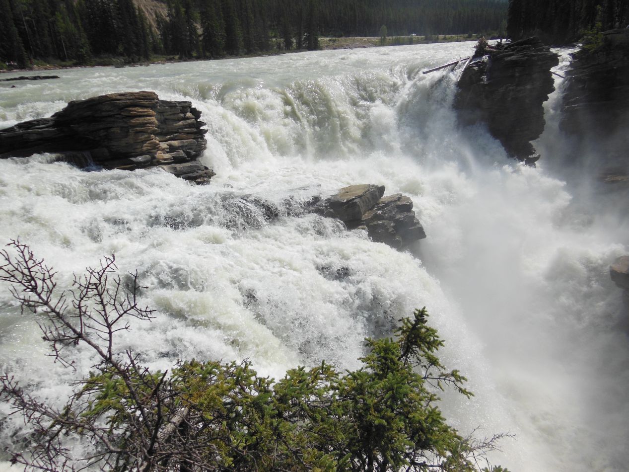 I didn't spend too much time at Mount Edith Cavell, only doing the short hike to the base of the mountain instead of ranging further afield. The next attraction along the Icefields Parkway was this waterfall, known as Athabasca Falls after the river of the same name that flows through them. While this waterfall isn't particularly tall at a size of only 25 meters / 80 feet, the sheer quantity of water passing through them is enormous. I could hear the pounding of the falling water as soon as I reached the parking lot, and the whole area surrounding the falls was bathed in a curtain of mist stirred up by their passing. The view of the mountains in the background with the falls in the foreground was postcard-perfect. Further down at the base of the falls, a small canyon had been carved out over time with little trees growing in odd, seemingly-drunk directions. This is apparently due to the water passing from a layer of hard quartzite over to a much softer layer of limestone, which has been eaten away by the flow of the water. Overall, Athabasca Falls was a nice place to stop and stretch the legs for a short break before continuing on the parkway.