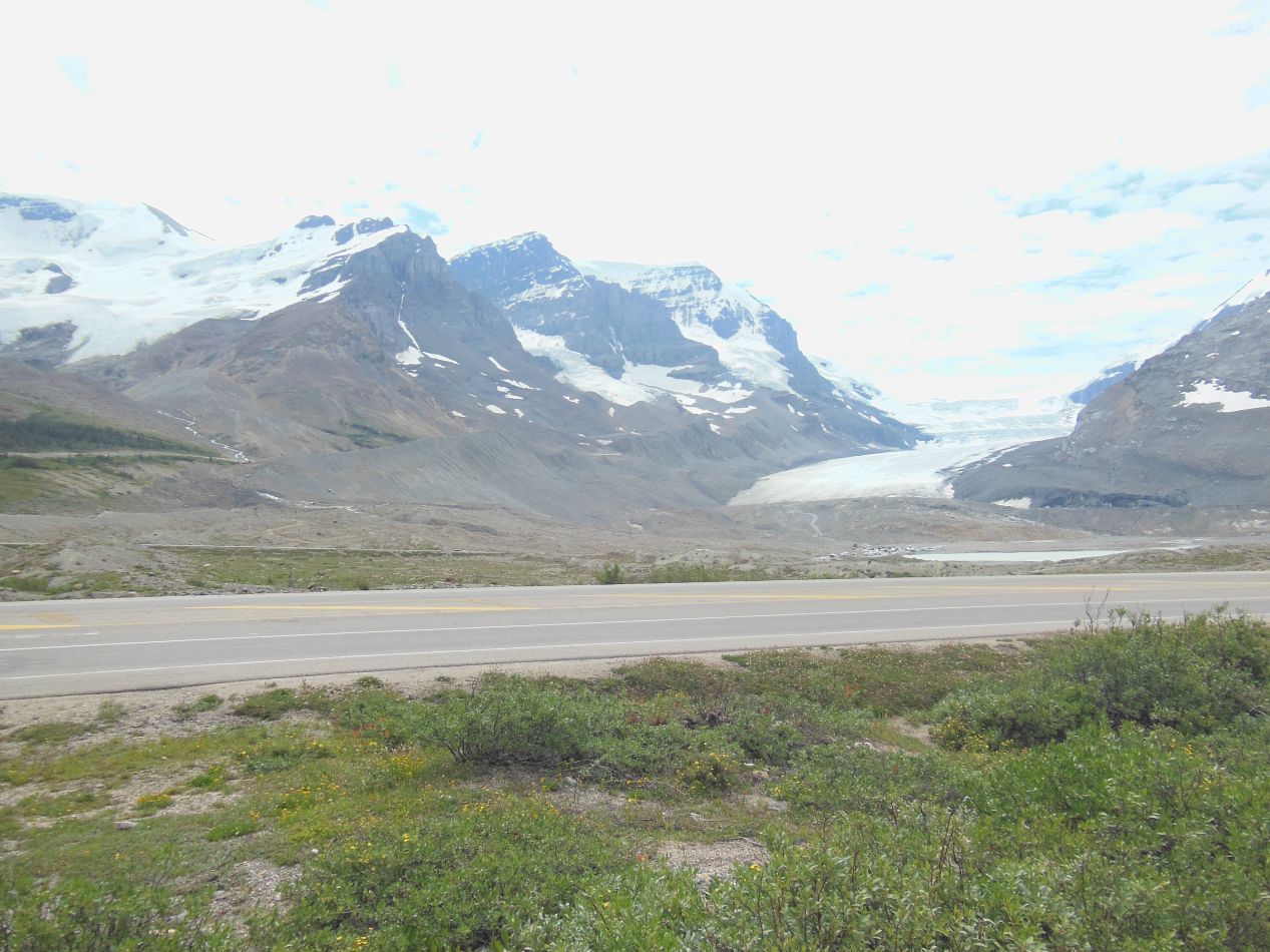 The next major stop took place at the Icefields Center. Located at the foot of the Athabasca Glacier, this is the hub for sightseeing trips that venture out onto the glacier itself. There's also a small museum with information about the history of the glaciers and their retreat over time as the climate has grown warmer. On the topographical map located in the museum, the Icefields Center was situated in the bottom-right hand corner below the Athabasca Glacier. This particular glacier was dwarfed by the much larger Columbia Icefield sitting on top of the mountains, the largest glacier located in the Rocky Mountains. Rivers that originate in the Columbia Icefield drain into the Atlantic Ocean (via Hudson's Bay), the Pacific Ocean, and the Arctic Ocean, making the icefield a triple continental divide. The comparison photographs from 1906 and 2006 were also a sobering reminder of the changing climate in this region. The glacier originally reached all the way down to the Icefields Parkway, but today it was clearly far short of the road.