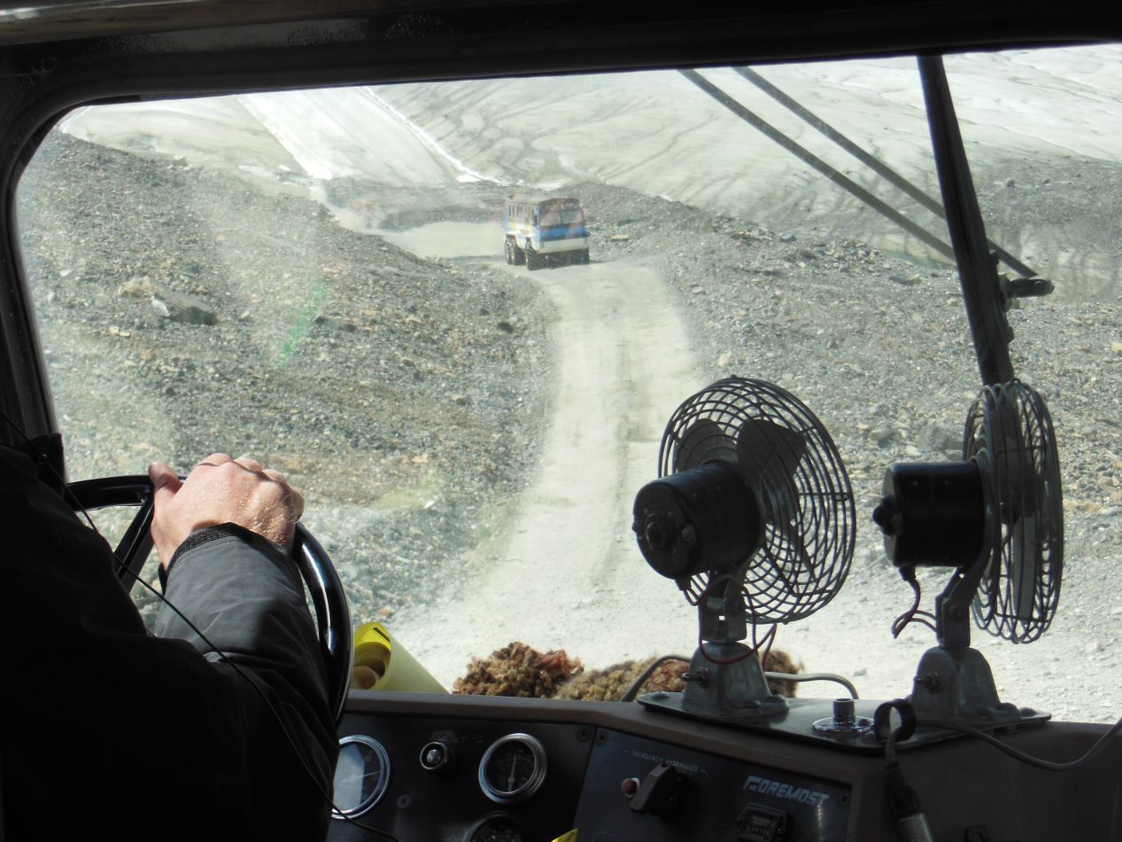 There were more specialized vehicles that traveled out onto the glacier itself, these massive snow coaches designed specifically to travel on ice. I've seen these things before on television shows being used in Antarctica and the ones here on the Icefields Parkway were built to the same design. They're a little bit like a tour bus combined with monster truck wheels. We left the normal bus and boarded one of these snow coaches, then headed down a dirty gravel road that led out onto the glacier. While driving along the "road" that had been cleared out for the snow coaches on top of the glacier, we were treated to up-close views of the snow and ice that made up the natural phenomenon. The glacier was not at all uniform, instead full of bumps and lines that had been caused by running water from the summer meltoff. As I've mentioned before, glaciers are also quite dirty when seen in person. This is not water that anyone would want to try drinking.
