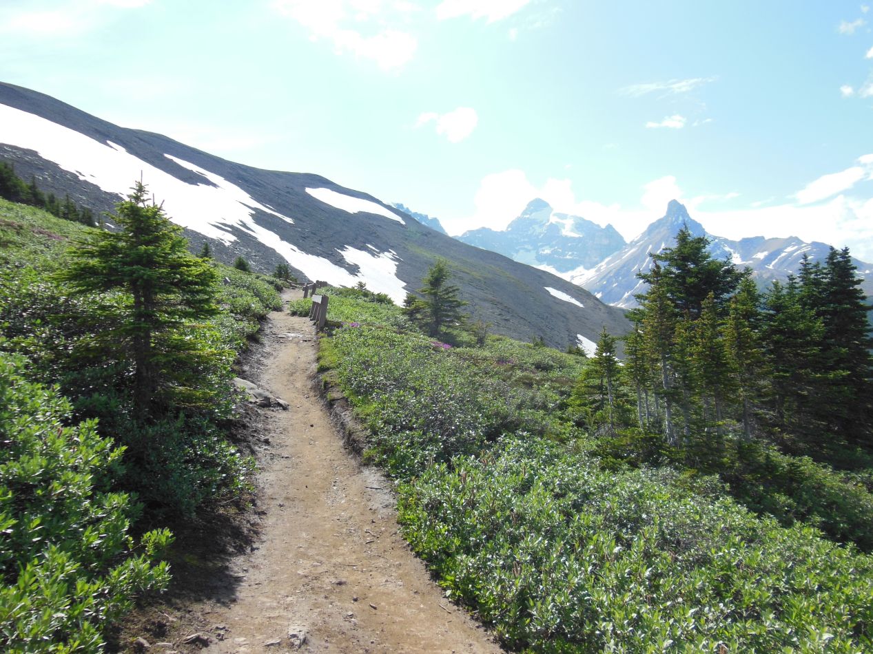 There was one more activity that I had planned for this day. A short distance down the Icefields Parkway, I crossed over from Jasper National Park into Banff National Park, and elected to go on another highly rated hiking trail. This was the Parker Ridge Trail, a short 5 kilometer / 3 mile roundtrip path that took hikers up to the top of Parker Ridge where there were views looking down at another glacier off in the distance. I had mostly been driving throughout the day and this was a good chance to get out and strech my legs a bit more. I found myself regretting that decision a bit when the trail led steeply uphill though. Still, it wasn't too bad and the scenery outside was certainly lovely here. The Parker Ridge Trail served up some beautiful views of the Icefields Parkway itself, which wound its way through the surrounding mountains as it crossed through Sunwapta Pass at 2000 meters / 6600 feet elevation. There were even other people hiking on this trail in a sharp contrast to the isolation of the Skyline Trail from the previous day.
