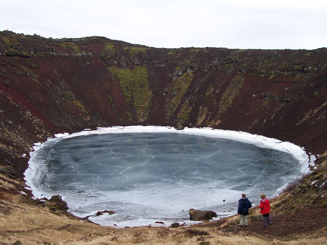 The next stop took place at a natural phenomenon known as Kerið, although I had to look that up afterwards since there were no signs at the site itself. This was a volcanic crater lake formed as the land moved over a localized hotspot, with an easily recognizable caldera containing a lake at the bottom. The place is about 55 meters (180 feet) deep and 275 meters (900 feet) across from side to side at the top. During the warmer months of the year the lake is full of cool water, but here in late winter it had all frozen over with ice. There was a rough path that led down to the lake's surface and I poked around a bit at the rocky shoreline. The ice was starting to break up and it was not safe to walk out onto it. This was one of the wilder natural formations that I'd seen, and it was especially fun to be here when the lake was frozen over. For that matter, I was also impressed at the utter isolation in the vicinity of Kerið; there was absolutely nothing at all in this area. Our bus would sometimes drive for minutes on end without seeing a single car passing on the road in the other direction.