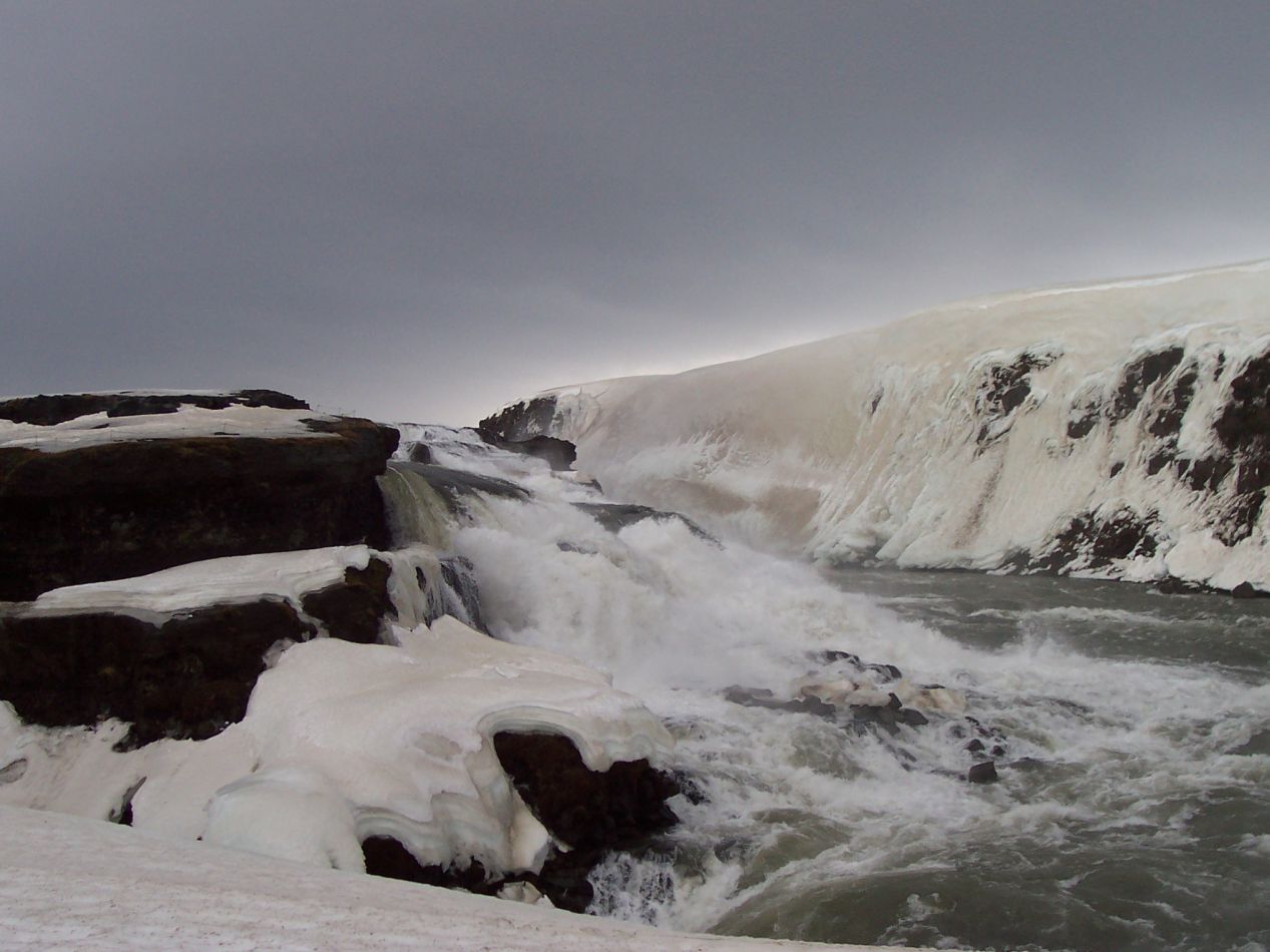 The biggest highlight of the whole tour was the place where we stopped next, the huge waterfall known as Gullfoss. Translated as the "Golden Falls", this waterfall drops about 32 meters (100 feet) into a canyon below and has become one of the most popular tourist attractions in Iceland. There was a plan earlier in the 20th century to turn the falls into a hydroelectic plant, which was blocked due to local activists until custody over the land eventually passed to the Icelandic government, which has made it a protected natural site. Most of the pictures that I've seen of Gullfoss take place during the summer, and indeed when I returned here a decade later in July, the place was swarming with tourists. The falls were a completely different story in winter, however. Our bus was the only one in the parking lot and there were perhaps two dozen people total at the site. The waterfalls kick up a lot of spray as the torrent of liquid races over the cliffside, and here in the winter a lot of that mist freezes due to the cold. The natural result was a series of fascinating ice patterns along the rocks, especially right at the edge of the waterfall where a thick layer of snow and ice had created a fat overhang of white. Combined together with the patches of snow clinging to the rock walls that surrounded the canyon, this was an amazingly beautiful spot. ![]()