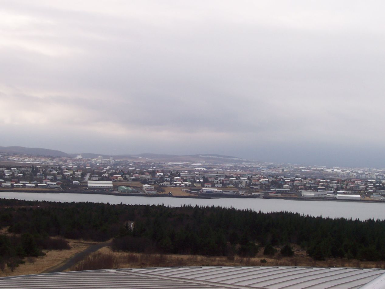 I flew into the airport at Keflavík, located on a small spit of land at the extreme southwest corner of the island. It takes about an hour's drive to travel from the airport to Reykjavik, the capital city of Iceland, where I would be staying for this brief two day trip. Fortunately for me, the whole travel package for this trip had been arranged ahead of time through a deal with Icelandair, and I was able to take a bus run by the airline company to the hotel where I was staying. This hotel was not surprisingly also owned by Icelandair and was called the Loftleiðir, the unattractive building of concrete and green paneling pictured above. This place was comfortable enough and I believe that it was actually the largest hotel in the whole country when I visited in 2005, but it wasn't a terribly attractive place from an aesthetic perspective. I had the chance to watch a little Icelandic television while I stayed here, as well as the German version of "Who Wants to Be a Millionaire". The closest building to this hotel was something known as Perlan, the domed building in the second picture up on the top of a hill. Perlan (translated as "the Pearl") is a revolving restaurant with an observation deck that provides arguably the best views of the city of Reykjavik. I took this next group of pictures from that observation deck on the top of the hill:
