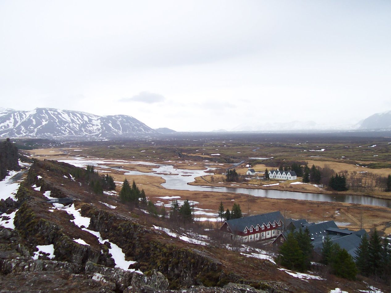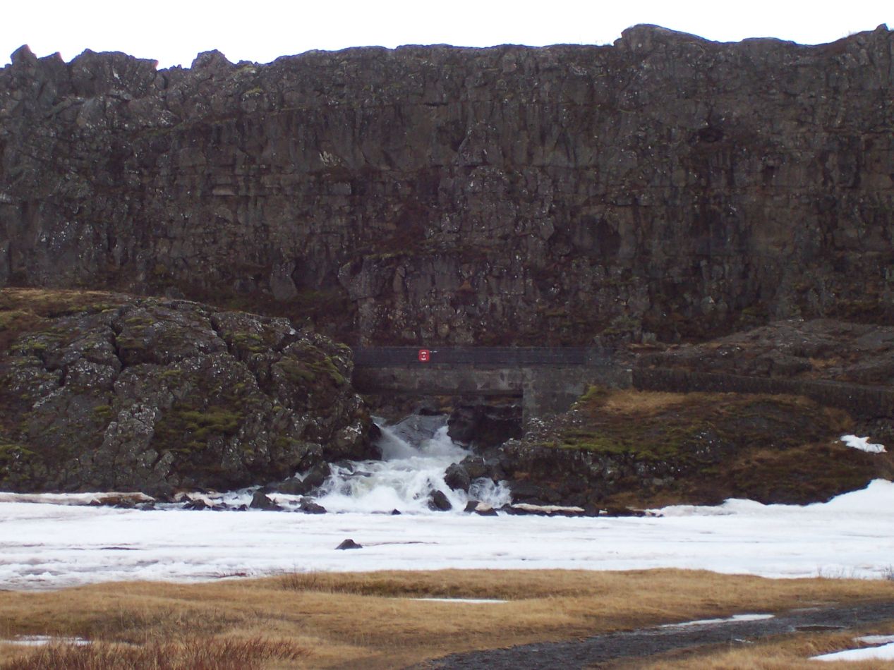 The last stop on this tour bus excursion took place in Þingvellir National Park, another geologically active area with a great deal of historical significance. Þingvellir (pronounced like "Thingvellir" in Icelandic) sits directly atop the Mid Atlantic Ridge where two different tectonic plates are in the process of moving in different directions. Millions of years from now, this activity will tear Iceland apart and create two separate islands with the sea flooding into this region. Þingvellir is also a historically important location, since this was where the medieval Icelandic Althing met in centuries past. Those gatherings took place from about 930 to 1270 AD on top of the hill known as the Lögberg, or "Law Rock" in Icelandic. There's a white pole placed on the spot today to indicate the spot. Here in the winter the park was a rather desolate location, the bridges and walking paths empty of other travelers, and with snow dusting the grasses. The sky remained overcast above and the waters of Þingvallavatn lake to the south looked extremely cold.