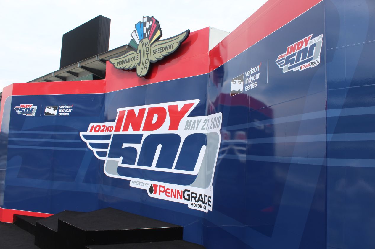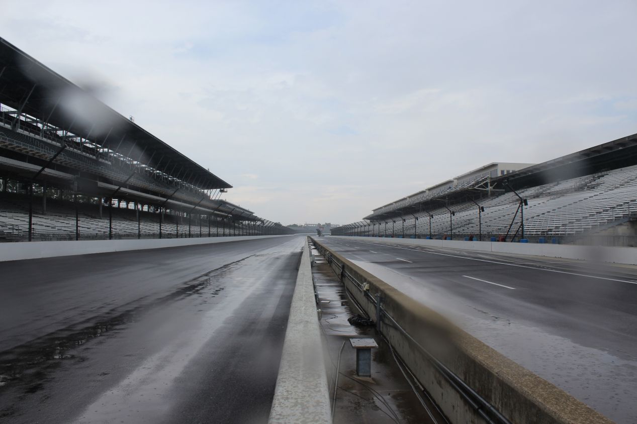 The victory podium was also nearby, elevated up on a second story platform above the starting line. This is where the winning racers pose for photographs and enjoy the traditional celebratory bottle of milk (yes, that's the real tradition here). It had stopped raining for the moment and this was another place to capture some excellent pictures of the grandstands near the starting line. The Yard of Bricks was easily visible, standing out both on the racetrack itself and in the section that leads to pit row.