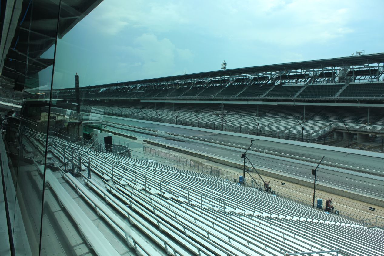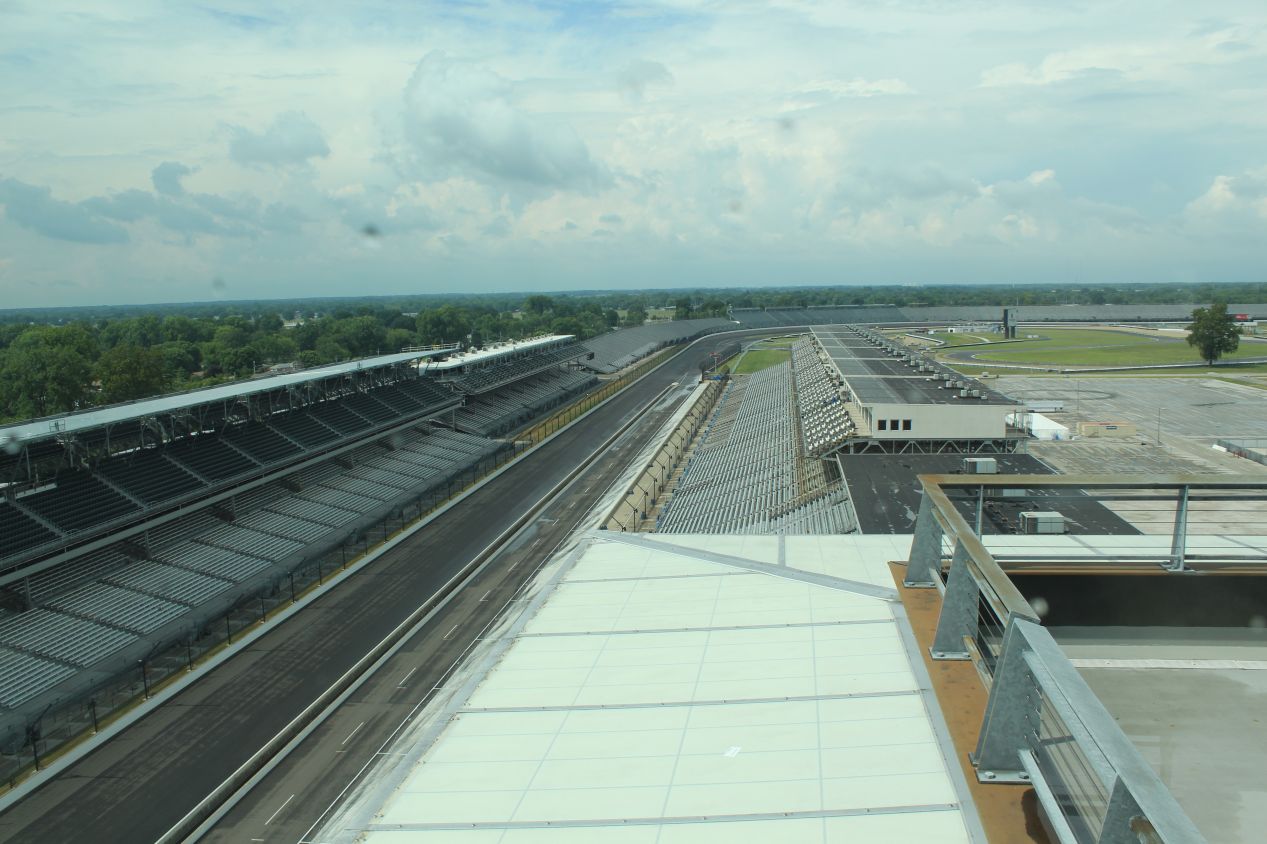 For our last location on the tour, we went up to the Timing and Scoring station on the top floor of the building overlooking the starting line. This building was originally designed to look like a Chinese pagoda, and when a new version of the tower was constructed in 2000, it kept the same pagoda style of architecture while adopting a sleek modern look made out of glass and steel. We were up on the tenth floor of the building and had a real bird's eye view looking down at the track, high enough to see the whole thing as it curved around the infield. Down below were the garages where the race cars are stored along with various administrative and support buildings used by the speedway. On a race day, the whole infield would be packed with well over 100,000 people camping out in RVs and drinking themselves into a frenzy. I don't think that I'd want to be there with them but I can appreciate the spectacle of it all.