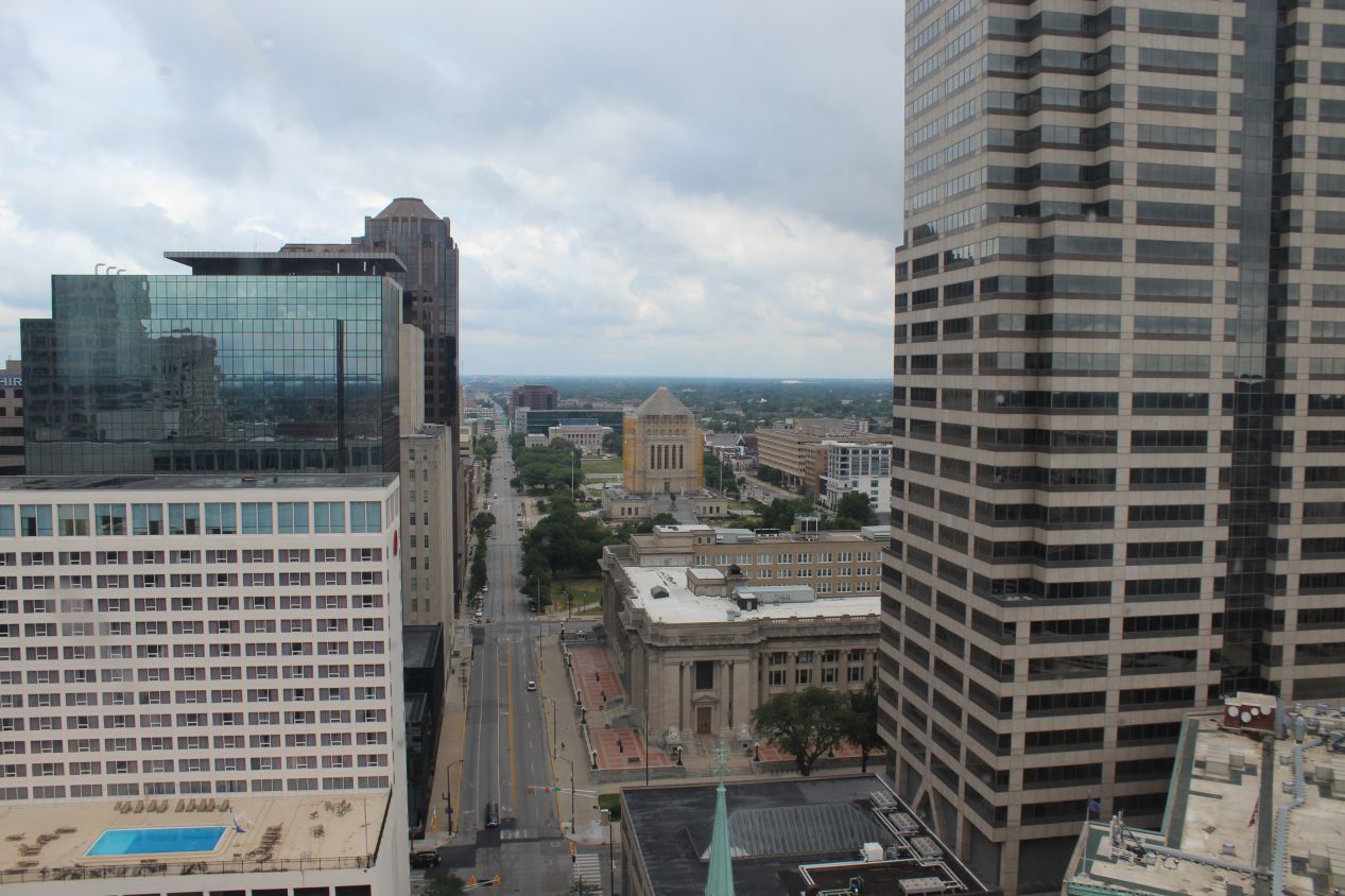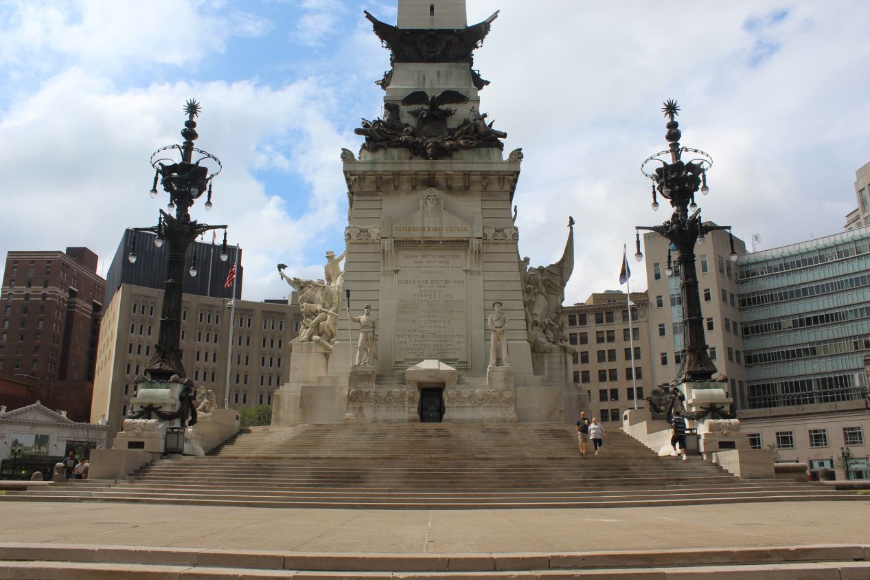 I was a bit surprised to find out that visitors can enter inside the Soldiers and Sailors Monument and climb up to the top for views of the city. On this particular day, the monument itself was open but the elevator was not, forcing anyone who wanted to make that trip to do it by foot. It took some effort to get all the way up to the tiny observation deck but I'd done plenty of harder climbs before. The view from the top was excellent, providing a bird's eye view of downtown Indianapolis. The tallest buildings in the city were concentrated in the area immediately surrounding the Soldiers and Sailors Monument, and Indianapolis' reputation as a financial center was reflected in the banking logos adorning these buildings. Off to the north, I could see the Indiana World War Memorial with its construction scaffolding, towered over by the height of the newer skyscrapers. To the south was the huge barn-like structure of Lucas Oil Field, home to the Indianapolis Colts of the National Football League. As a Baltimore sports fan, that was one place and one team that I had no desire to see up closer. Finally, nearby to the west was the Indiana State House, the state capitol building that I'd be heading off to visit next.