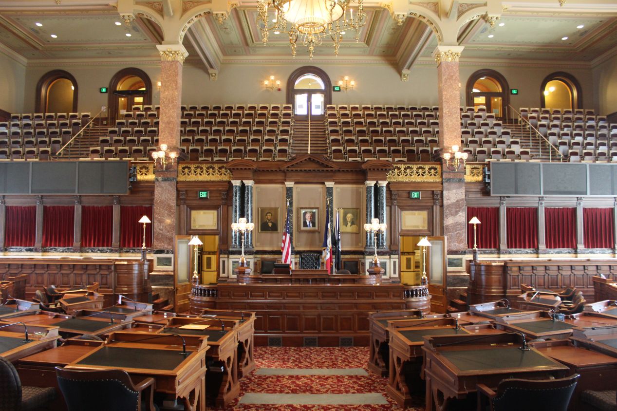 We visited the Senate Chamber first and had the chance to see the room from both the main level and also the viewing gallery raised up above the floor. The Iowa Senate has 50 seats in total, with senators elected to four year terms. Once again the standard design for an American legislative chamber was in evidence, with a central rostrum occupying the back of the room and then semicircular rows of desks radiating out from that starting point. The Senate Chamber had a bit of a feel of a grand ballroom, between the chandeliers on the ceiling and the long red drapes along the windows. I did like the design at the top of the windows, with a letter "I" for Iowa located in the middle of a classically-inspired laurel wreath.