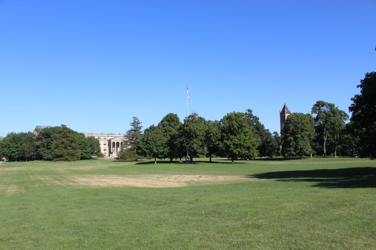The Iowa Old Capitol Building was situated high enough that I could look out towards the other half of the campus across the river and see many of the buildings there, including the huge University of Iowa hospital. The university is known for its medical program and the hospital situated on campus is one of its best-known landmarks. The area immediately surrounding the Iowa Old Capitol Building was the first place that had the traditional campus accoutrements, with the manicured green lawns and the stately classroom buildings that everyone expects to see. This was the very last place that I saw on campus and I'd been surprised by the lack of these attractions before finally finding them. The whole area around the Iowa Old Capitol Building looked lovely on this summer day and I was glad that I had taken the time to walk over to it. The presence of the former state capital made the University of Iowa distinctive and stood out from the other universities that I'd been visiting on this trip.