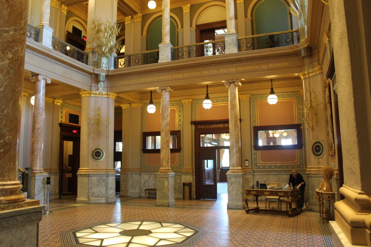 The first place that I stopped in Des Moines was the World Food Prize Hall of Laureates building. The World Food Prize is an international award created in 1987 that recognizes the achievements of individuals who have advanced human development by improving the quality, quantity, or availability of food in the world. This organization very appropriately chose the state of Iowa for their headquarters, as Iowa is specifically known for its agricultural production of corn, soybeans, pigs, and cattle. The World Food Prize uses the former Des Moines Public Library central building as their headquarters, and this was a striking location situated next to the river in the downtown. One of the staff members generously took me on a 15 minute individual tour of the building, walking me through the reception hall on the ground floor and up to the art galleries and food exhibits on the second floor. They could not have been more kind to me during my visit and the building itself was a marvel. Anyone who wants to see the World Food Prize building will need to time their visit carefully, however: this place is only open on Tuesdays and Saturdays and only for limited hours on each day. It was pure dumb luck that my one stop in Des Moines happened to take place on a Tuesday and I was able to see this attraction.