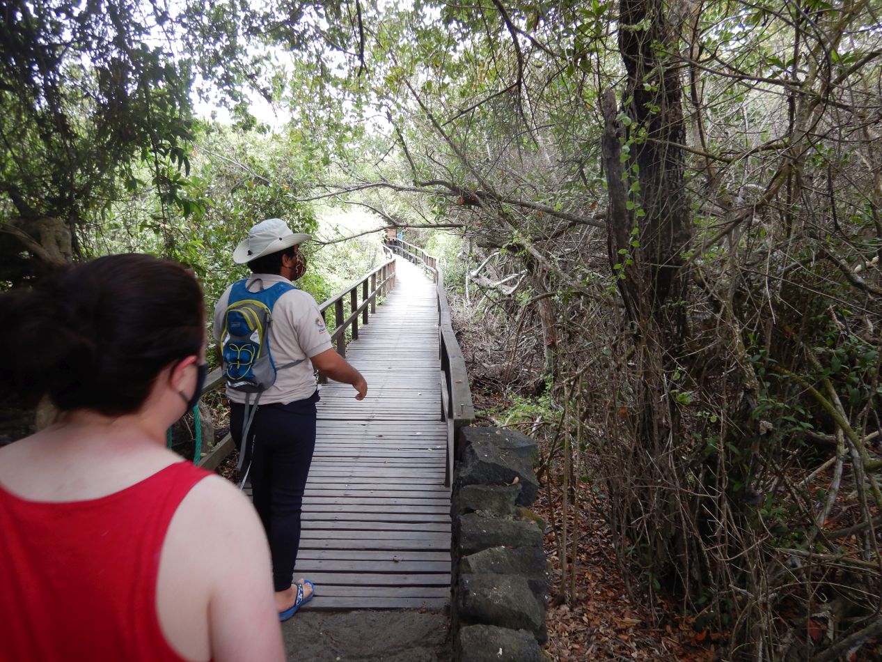 Eventually we made it back to the trailhead and then caught a return car ride back to our hotel at Coral Blanco. After a short break to change our clothes, we headed out for our shorter afternoon activity which would be a snorkeling excursion at a little enclosed area named Concha de Perla. This place could be reached in about five minutes of walking from Puerto Villamil's dock where we had arrived the previous evening. The walk to Concha de Perla turned out to be a boardwalk running through a forest of mangrove trees that grew along the shoreline. Pablo remained our guide for the afternoon (the other four members of our initial tour had disappeared elsewhere so it was just the three of us) and pointed out the different types of mangroves that we were seeing. There are four different types that grow in the Galapagos: red, black, white, and button mangroves. Their branches formed a canopy that the boardwalk passed underneath. We also spotted lots of marine iguanas along with...