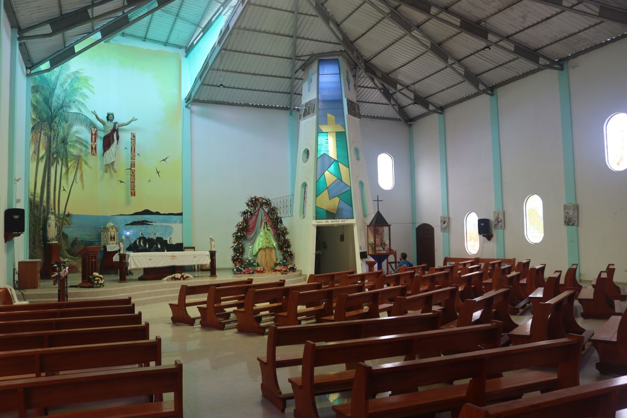 Pictured here was the most notable building in Puerto Villamil, the church Iglesia Cristo Salvador. The population of the Galapagos is overwhelmingly Catholic and this is the main place of worship on the island of Isabela. Cristo Salvador stood out because it incorporated some of the local wildlife into its decorations. We spotted Galapagos penguins, flamingoes, and blue-footed boobies depicted in stained glass windows on the outside of the church, and then the main altar had a landscape painting behind it featuring more of the endemic animals. There was even a big lighthouse that stuck up through the roof of the building and was visible from the street outside. Everything was bright and colorful when we stopped to take a look, with Cristo Salvador having a warm and friendly atmosphere.