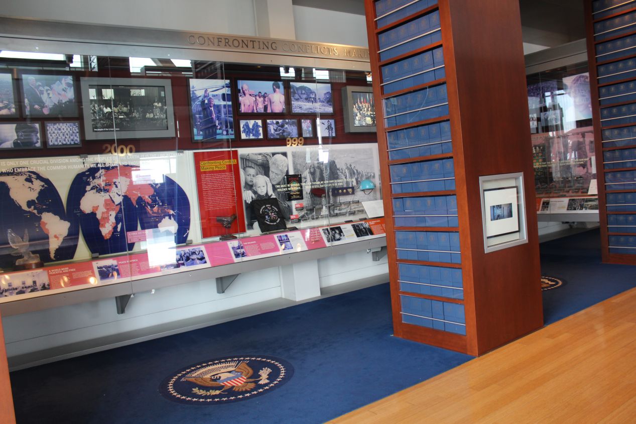 The core of the museum is the long rectangular section that runs off towards the riverbank. The design for this part of the museum was based on the library at Trinity College in Dublin, with long stacks of archival materials running down the sides of the room and tall glass windows that let in lots of outside light. The subject matter is of course devoted to the Clinton presidency, which ran from 1993 to 2001, and it was impossible for me to walk through this exhibit without feeling a lot of nostalgia for the 1990s. That was the decade when I grew up and had my most formative years (I was born in 1982) and I can remember hearing about all of the different issues that the museum highlighted on these big displays. In addition to the main timeline in the center, the sides of the room contained more specific exhibits on components of Clinton's administration, like a section on energy policy or the drive to reduce unemployment. The main criticism of this museum is that it's overly sympathetic to Clinton's presidency, and I found that very much to be the case. There's not much here on the Monica Lewinsky scandal that dominated Clinton's second term, and no mention at all of the egregious lame duck pardons that Clinton issued at the end of his term to shady figures like Marc Rich. This wasn't really a surprise given that I was visiting the Clinton Presidential Center but it would be nice if the place was a little bit less self-congratulatory.