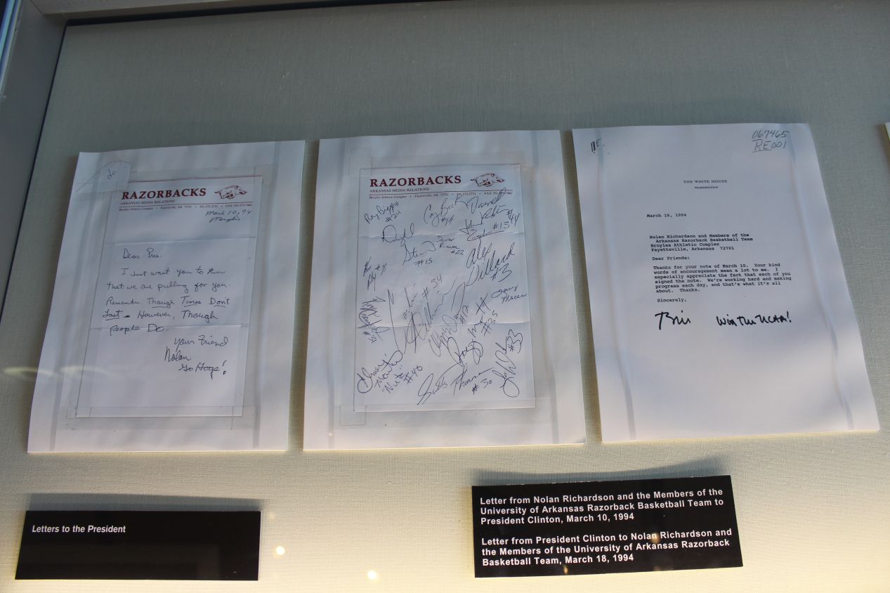I think that my favorite part of the museum was the back side of the main timeline, where there were about two dozen different personal letters on display that had been sent to and from the Clintons. Among the most interesting were a brief letter from Mother Teresa to Hillary Clinton, and this signed letter from the University of Arkansas basketball team to Bill Clinton in 1994, which earned a hand-written response of "Win the NCAA!" The Arkansas basketball team would go on to do exactly that a few weeks later, taking the 1994 national championship by defeating Duke in the title game. Elton John and Arsenio Hall also had letters included in the collection; Bill Clinton famously went on Arsenio Hall's late night talk show and played the saxophone during the 1992 presidential campaign. The president wrote back to Hall by saying "I like this job but it's tough going a lot of the time and I think I should be playing 'Heartbreak Hotel' on your show!" As a history Ph.D, I love these little details that get captured when going through archival documents, little snapshots into the personalities of those entrusted with power. For instance, I read through dozens and dozens of correspondences of Richard Wellesley, Lord Mornington, as part of my doctoral dissertation, and they left no doubt that the man was an egotistical jackass. Clinton's letters on display here suggested a good-natured chumminess, as well as a certain willingness to bend the rules a bit for his friends.