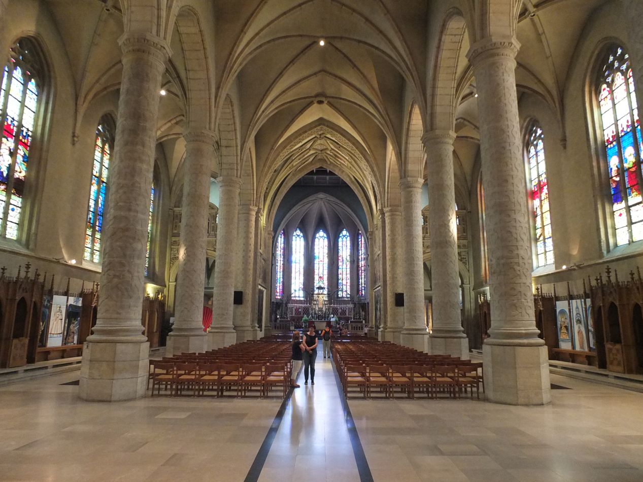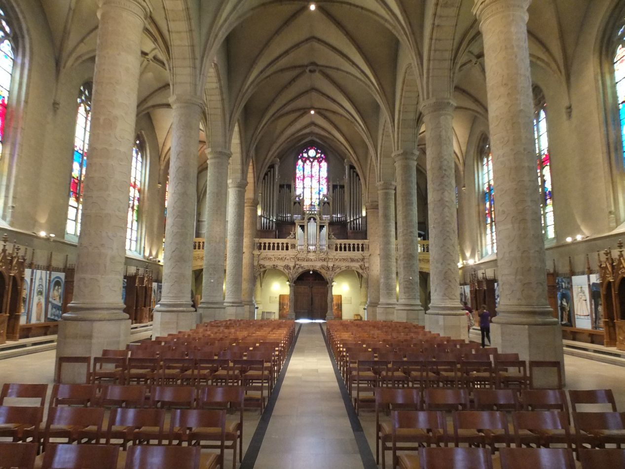 The first site that I came across in the city center was the Notre Dame Cathedral of Luxembourg. This was a much smaller and more recent version of the classic Gothic design, dating from the 17th century instead of the medieval period. I liked this building immediately, with its more intimate feeling and cozier dimensions as compared to the enormous size of a place like Cologne Cathedral. Notre Dame of Luxembourg had some unusual decoration on its central pillars, in a pattern that I didn't recognize. It almost looked like a Celtic design, although I don't think that's what it was. The building's best feature was the altar at the far end of the main aisle, where a beautiful series of stained glass windows cast the incoming sunlight into a dazzling rainbow of colors. This is the national cathedral of Luxembourg, and it reflects the small, wealthy status of this nation.