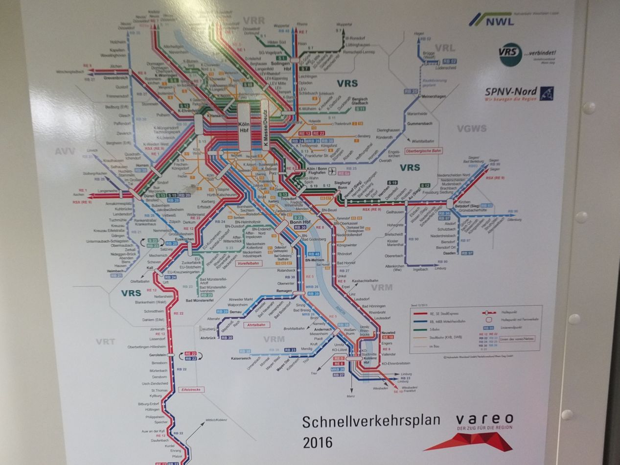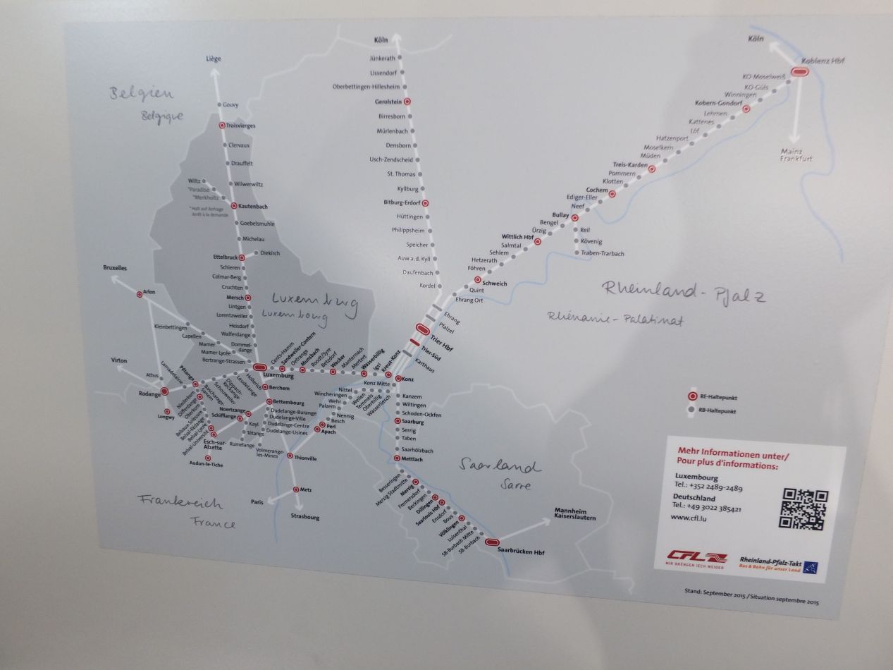 Most of my rail journeys were uneventful affairs, passing smoothly from one major European city to another. The trip on this day proved to be the exception. I needed to travel from Cologne to Trier, a small city in western Germany close to the border with Luxembourg, and from Trier I could transfer onto another train that would take me into Luxembourg City. On the rail map above, Trier was located in the southwest corner, just outside the borders of that image. I boarded one of the trains heading to Trier without thinking anything of it, and for a couple hours nothing out of the ordinary happened. The trouble began when I reached the small town of Gerolstein. My train stopped there for an unusually long time, and then began moving backwards the same direction that it had started. What the heck?! Apparently I had been on the "RE22" line, and that line stops at Gerolstein and heads back to Cologne on a loop. The train announcements had probably made that clear, but this was a local train and everything was in German, a language I didn't know. I rode back to Kall and left the train, transferring onto another one. Now I knew what I had to do: ride the initial train to Gerolstein and then transfer there onto a new train heading south to Trier.