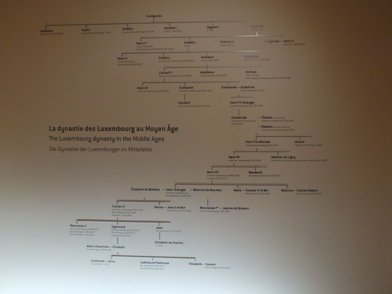 I also learned a good bit about the medieval House of Luxembourg, which I can fairly say I knew nothing about previously, and how they produced several different Holy Roman Emperors in the 14th century. There was a strange room with circular painted walls designed to reproduce what the street in front of the Ducal Palace would have looked like in the 17th century. This produced a confusing visual effect; it almost looked like it was possible to walk off down the cobblestone roads. There was also more information about how Luxembourg was repeatedly partitioned over the years until it reached its current small status, the brief personal union with the Dutch royal family in the 19th century, and the experience of German occupation during the world wars. The museum even had the Grand Duke's throne, and not a reproduction, the real thing. The ducal family is kind enough to let the museum keep it when it's not being used for state occasions. This was a top notch place for a historian to visit, and I probably used up too much of my limited time inside.