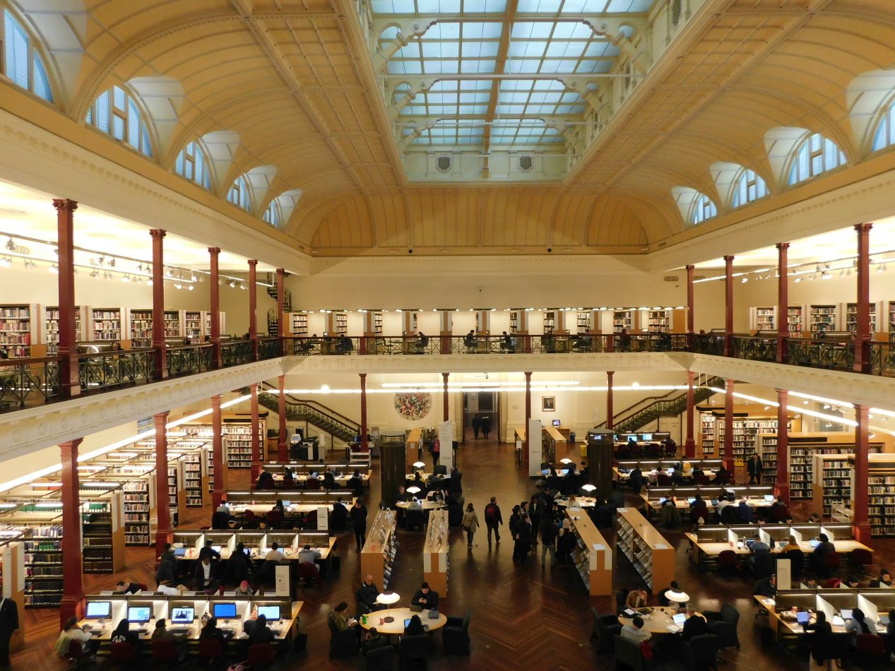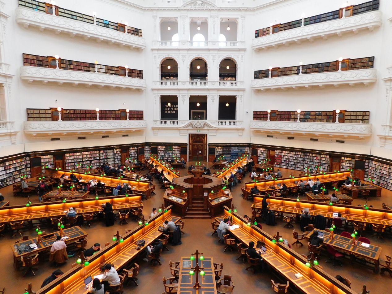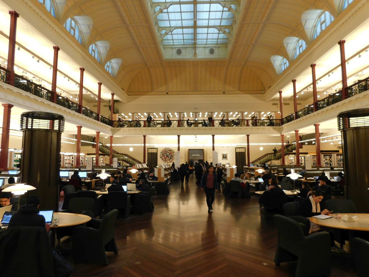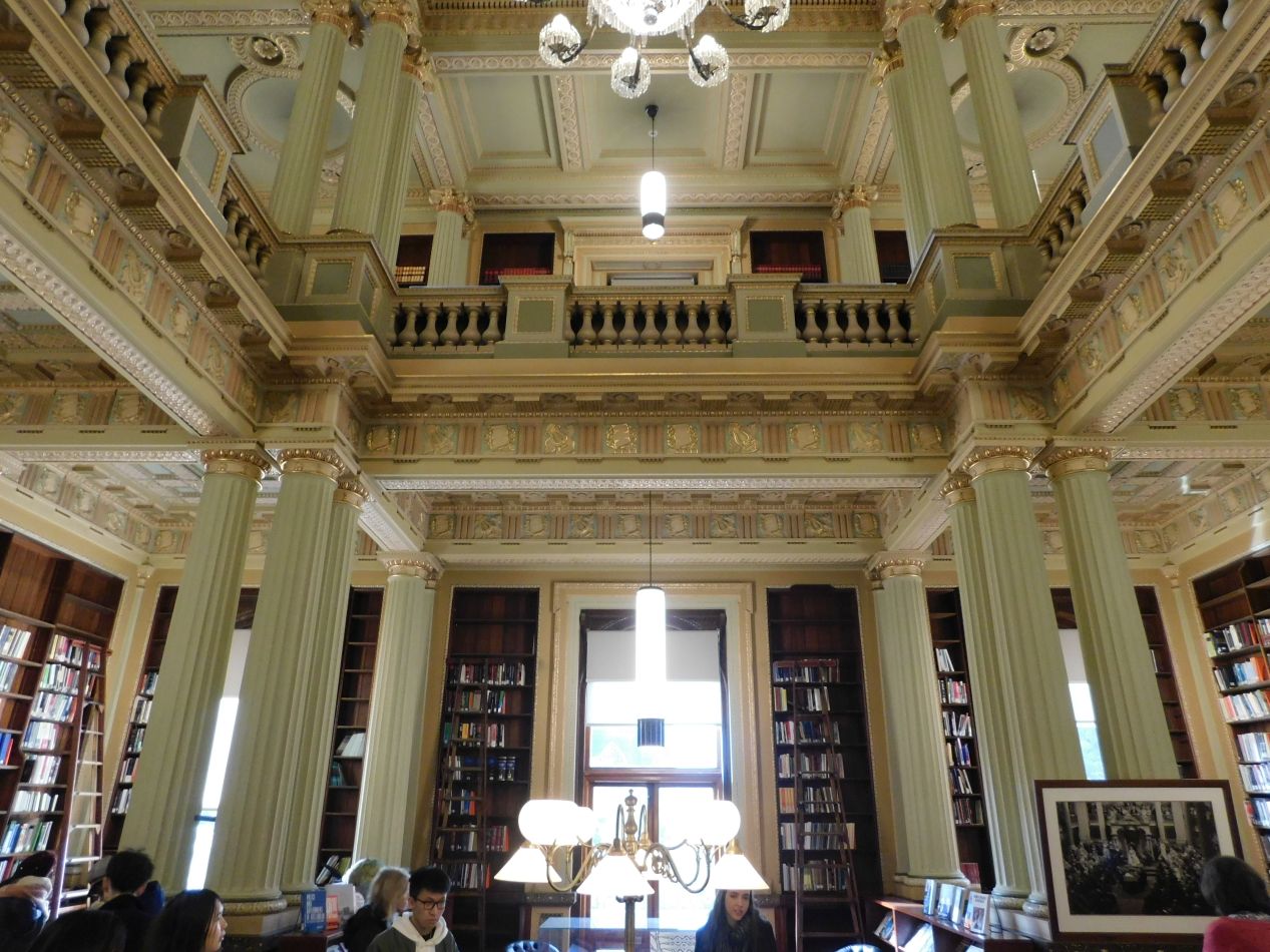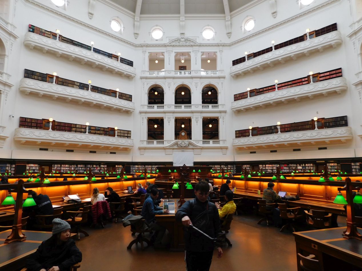 Only a block away from the gaol along Russell Street was the State Library of Victoria. We'd passed the library while walking up to the gaol a little bit earlier, and decided to stop inside on a whim to take a look at its collections. This proved to be an excellent decision, as the library was a beautiful building that dated back to the 1850s and boasted more than 2 million books held in its collections. (We entered the library from what is effectively the back side and therefore missed out on its impressive main facade.) Most of these pictures depict the Redmond Barry Reading Room on the eastern side of the library, with its two tiers of floors full of book shelving and individual reading desks. This room was packed with individuals hard at work and I couldn't spot a single empty desk going unoccupied.