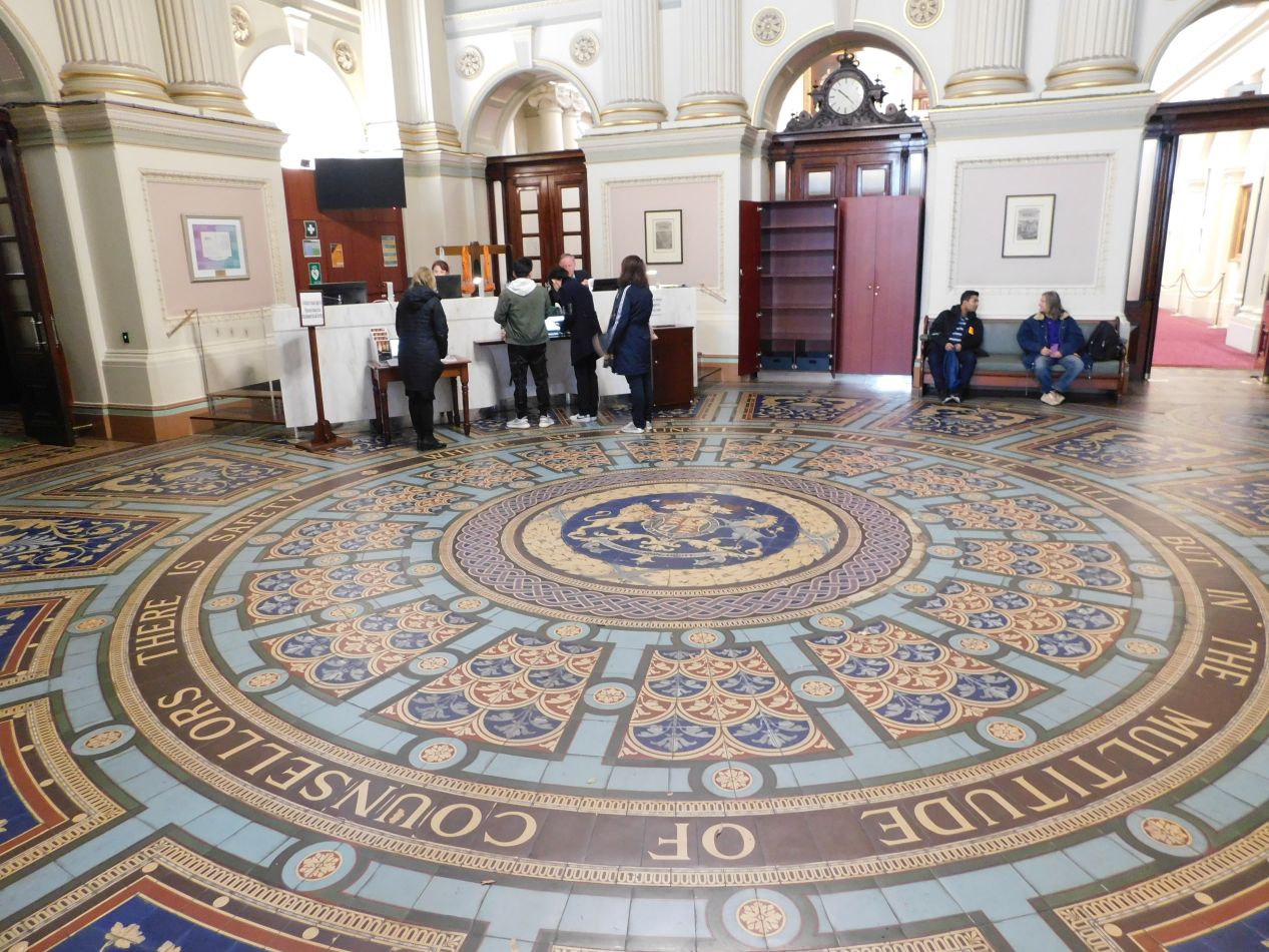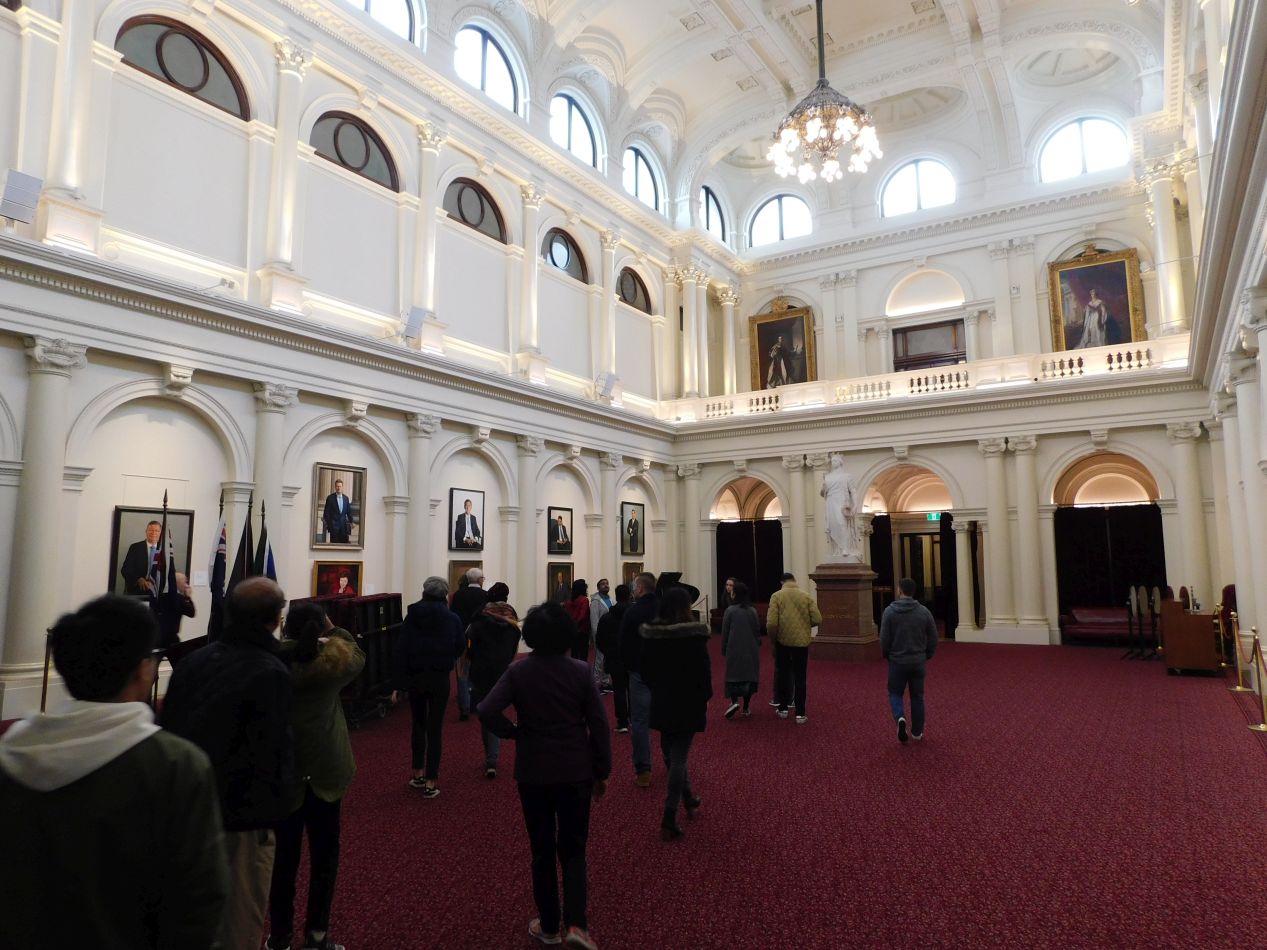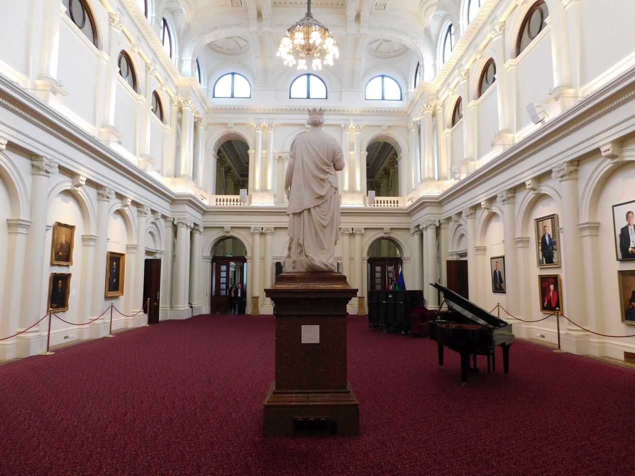 The following Monday was our main day to explore downtown Melbourne, and we started out by walking across the street to the Parliament House, seat of the parliament for the state of Victoria. Construction started on Parliament House in 1855 and has infamously never been completed; the original plans called for a dome that still had not been added at the time of our visit in 2019. (Sure enough, when we visited the building there was a construction project taking place on one of the wings.) Unlike the other parliament buildings that we'd been visiting in Australia, this Parliament House was built in a Neoclassical design that incorporated dozens of Greek columns. That design aesthetic tends to be more common for American legislative buildings than ones in the British tradition. Inside the building, we spent about 10 minutes in the vestibule with its enormous tiled floor, waiting for the next tour group to begin. Once it did take place, our group was ushered into this ornate hall located in the center of the structure. Known as the Queen's Hall, this room featured a statue of Queen Victoria and dates to 1879. It contains a series of paintings of past Premiers of Victoria, the state's equivalent of a prime minister chosen by the governing party. This room is used for various state functions, often as a place for conversation and mingling when the Parliament House is hosting various important dignitaries.