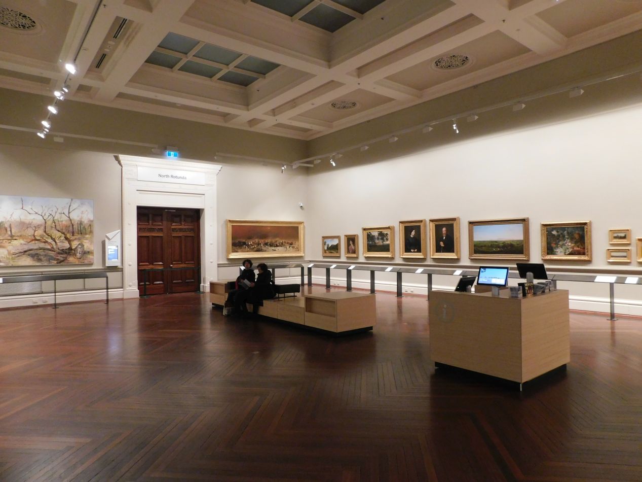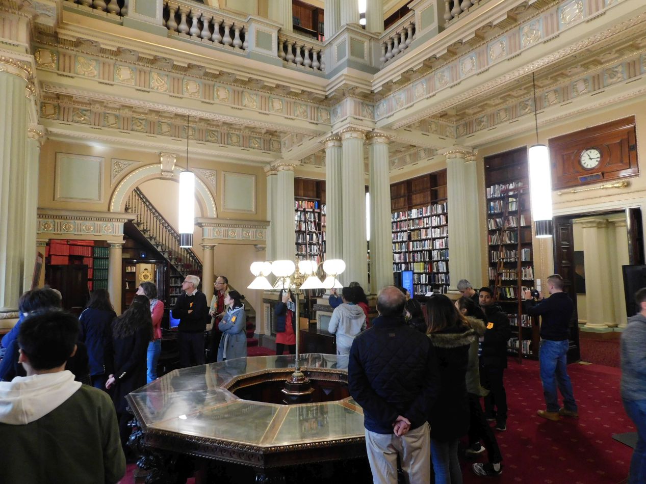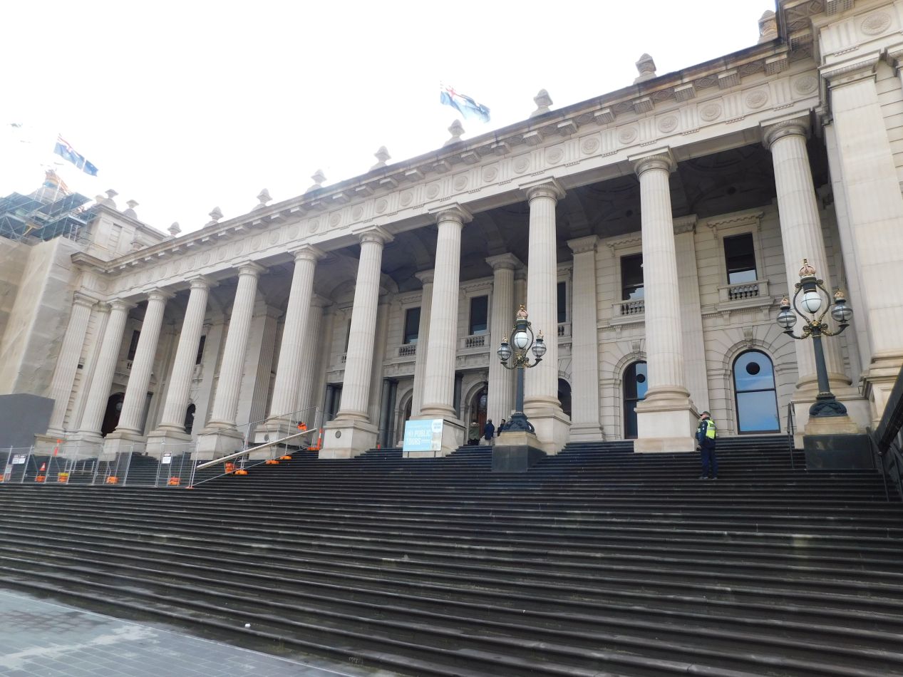 The following Monday was our main day to explore downtown Melbourne, and we started out by walking across the street to the Parliament House, seat of the parliament for the state of Victoria. Construction started on Parliament House in 1855 and has infamously never been completed; the original plans called for a dome that still had not been added at the time of our visit in 2019. (Sure enough, when we visited the building there was a construction project taking place on one of the wings.) Unlike the other parliament buildings that we'd been visiting in Australia, this Parliament House was built in a Neoclassical design that incorporated dozens of Greek columns. That design aesthetic tends to be more common for American legislative buildings than ones in the British tradition. Inside the building, we spent about 10 minutes in the vestibule with its enormous tiled floor, waiting for the next tour group to begin. Once it did take place, our group was ushered into this ornate hall located in the center of the structure. Known as the Queen's Hall, this room featured a statue of Queen Victoria and dates to 1879. It contains a series of paintings of past Premiers of Victoria, the state's equivalent of a prime minister chosen by the governing party. This room is used for various state functions, often as a place for conversation and mingling when the Parliament House is hosting various important dignitaries.