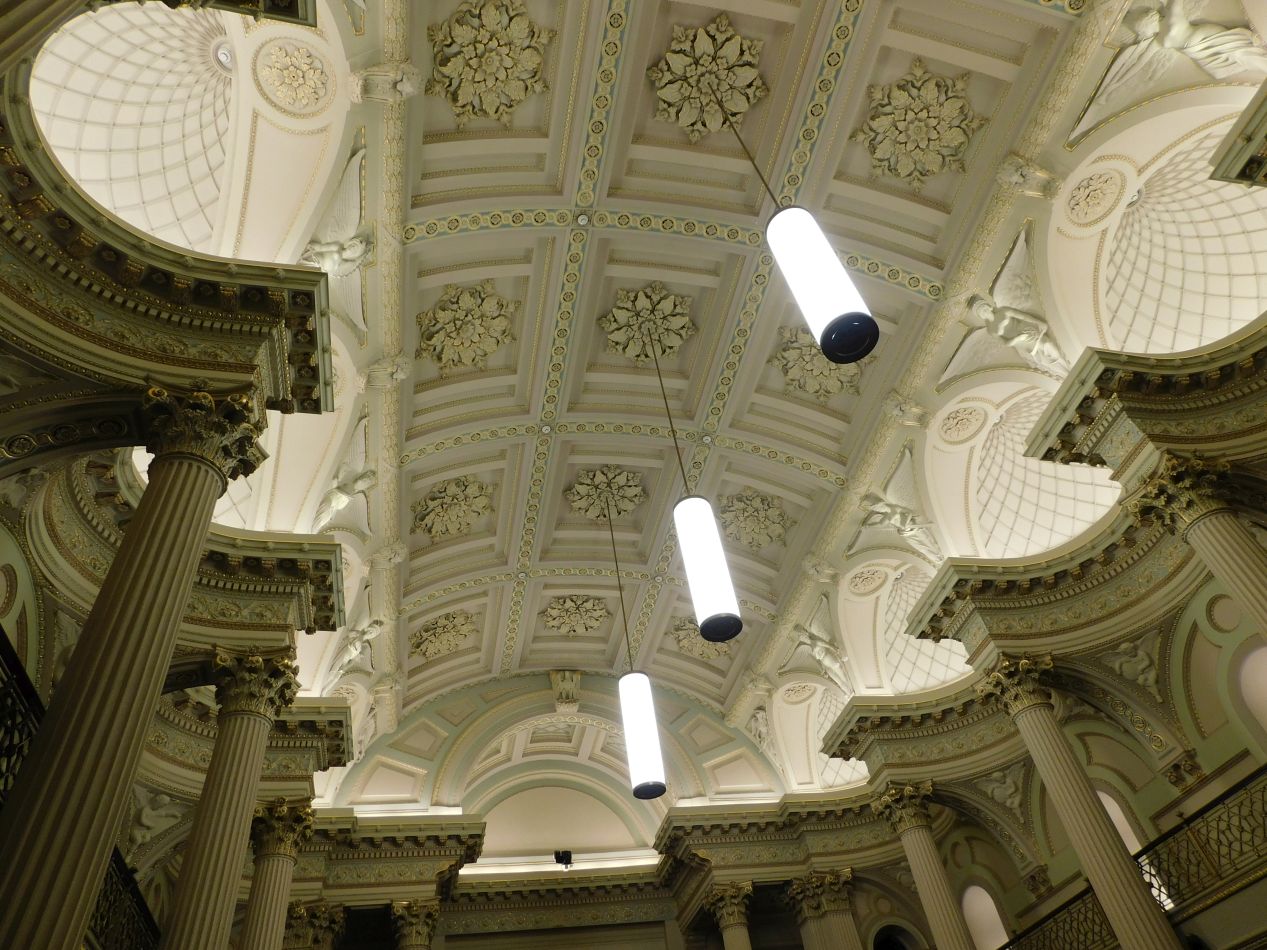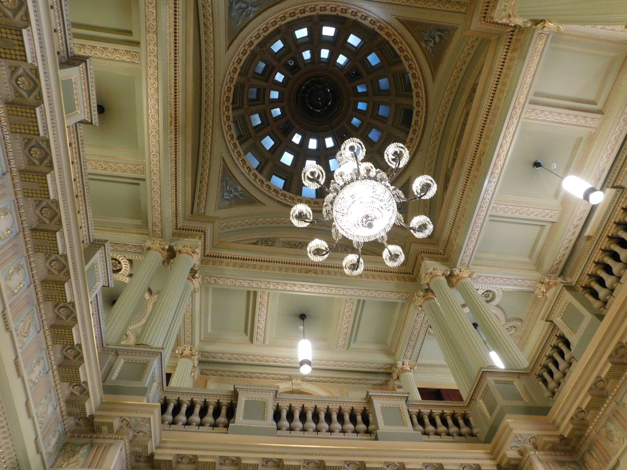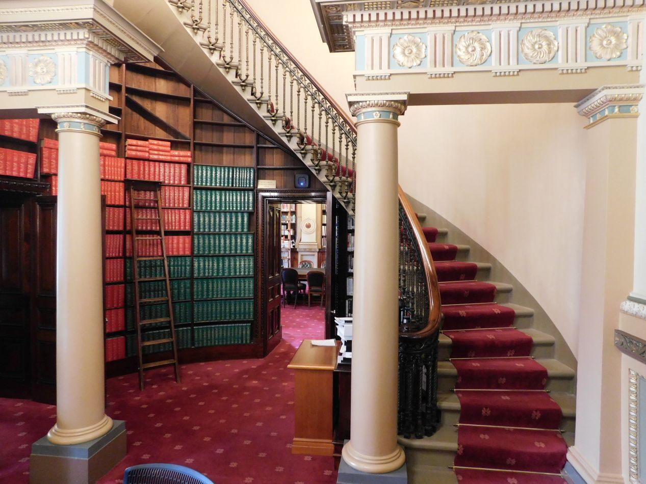 The last place that we visited on the tour was the library portion of Parliament House. This was the first part of the building to be completed in 1860, and it was old enough that the tour guide pointed to various small vents in the floor where fires were burned for warmth during the cold months of the year. (Fires in a library - maybe not the best idea.) The historic library was intended to hold all of the papers associated with government business for Victoria, although of course it has become far too small for that role over the years and most of the records are now stored in offsite locations. This was a beautiful little reference library, however, and we appreciated the chance to see more of the Neoclassical architecture on display. This was one of the domes that actually was completed instead of being stuck in endless construction limbo.