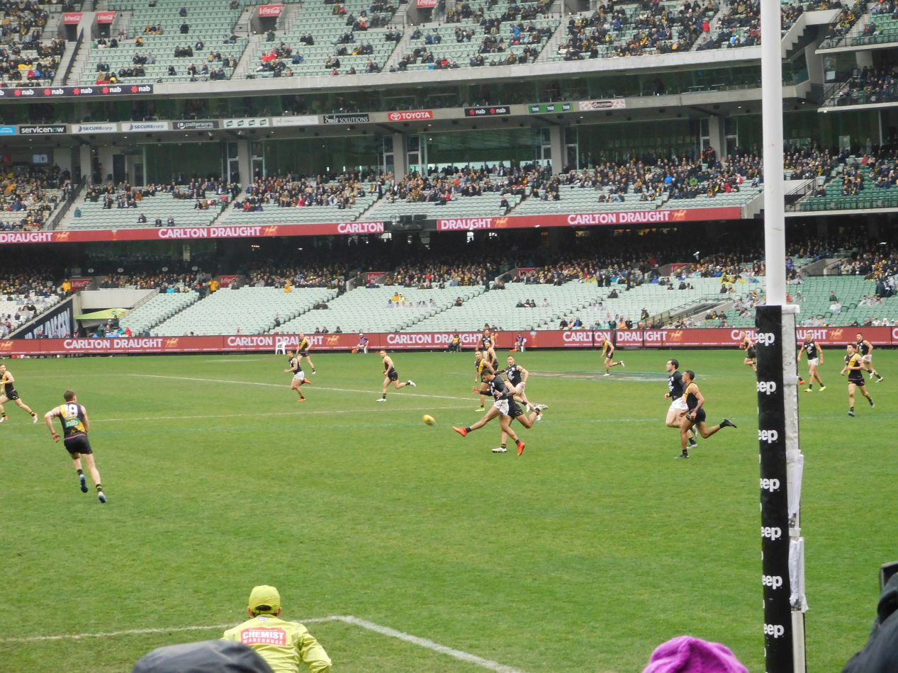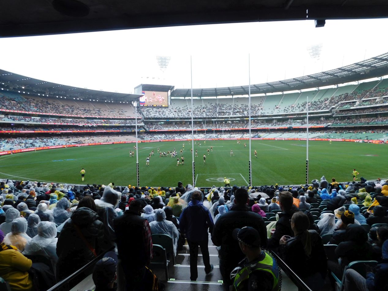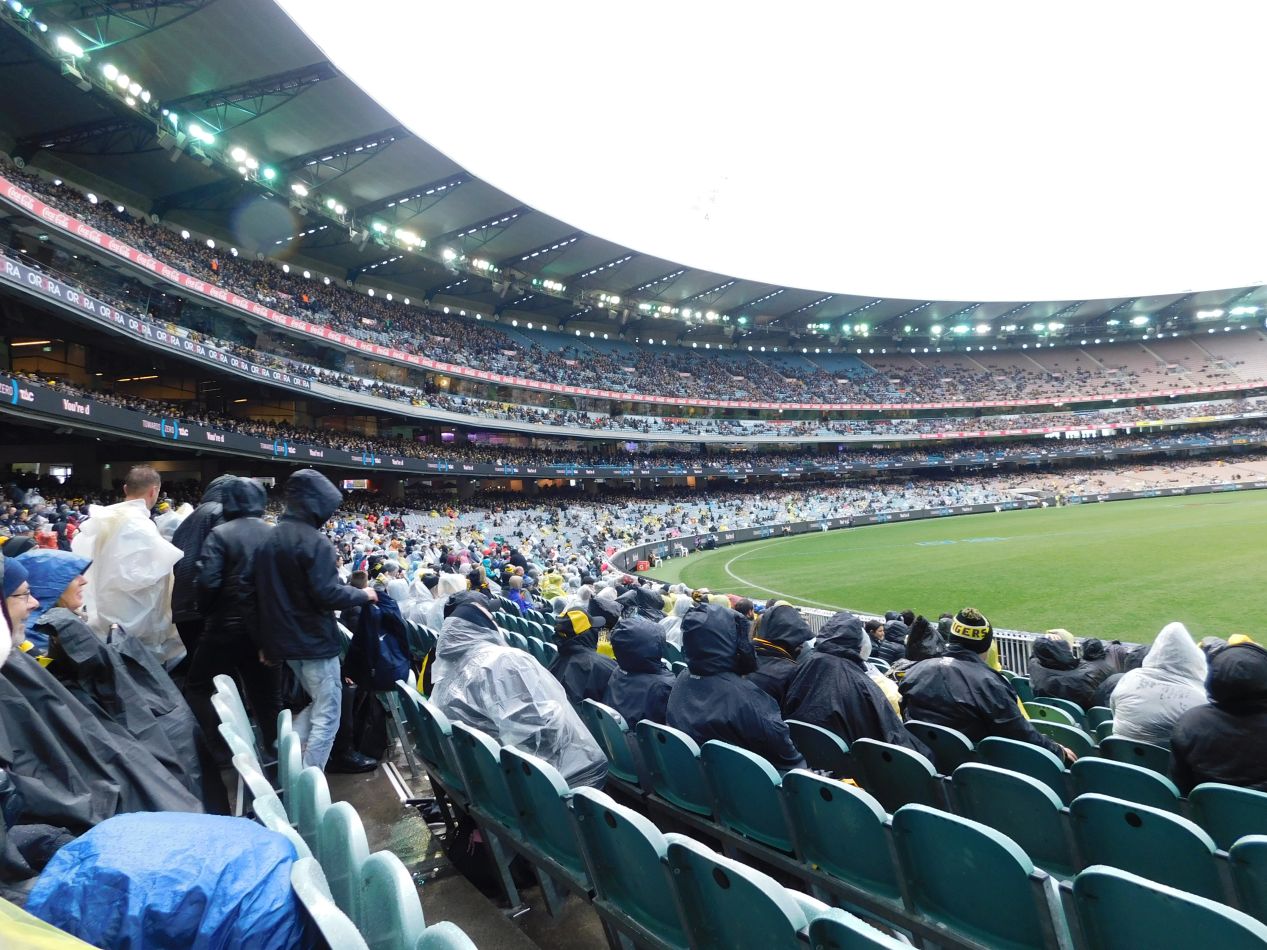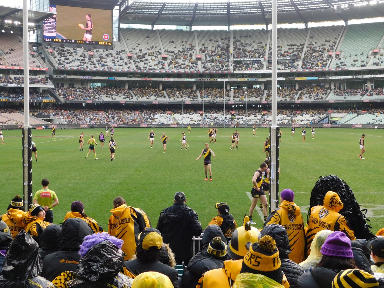 Then as far as the competitive nature of the match went, it also proved to be a letdown. We looked up the standings before the match and found that the Richmond Tigers were near the top of the table, coming into the day in fourth place. Meanwhile, although the Carlton Blues were an ancient and historic team, this was not one of their better seasons as they languished in 16th place. It was a mismatch on paper and proved to be a mismatch out on the pitch as well. Richmond scored early and often, amassing 6 goals in the first quarter and jumping out to a lead of 39-4. Even without knowing very much about Aussie football it was obvious that Richmond was the far superior side between these two opponents. We turned out to be seated in the Richmond fan section, and every time that the Tigers scored the people around us would break out into wild cheering and waving of huge flags. I suspect that the atmosphere would have been even better if so many fans hadn't stayed home due to the weather.