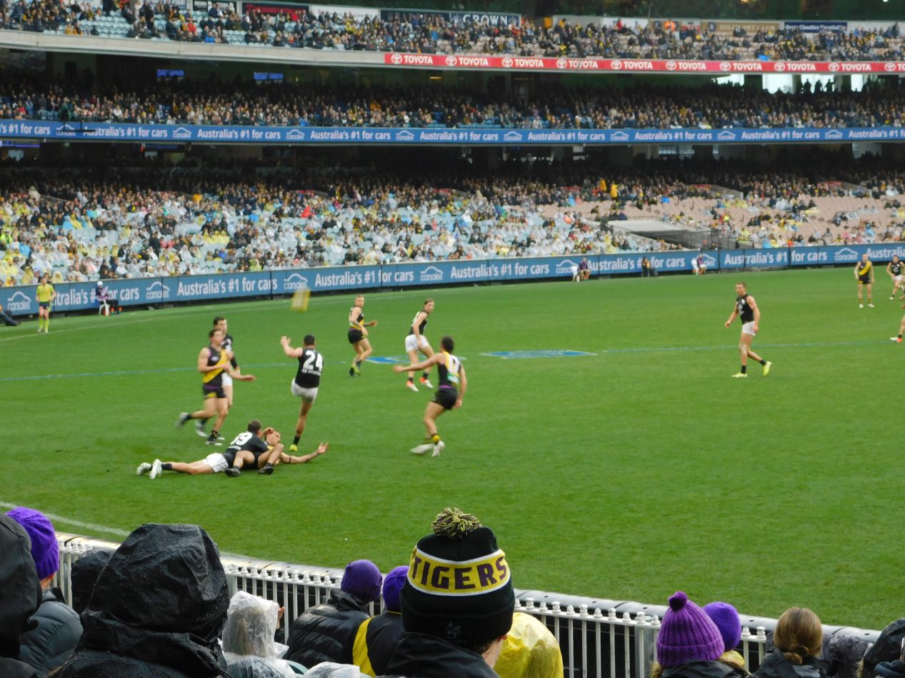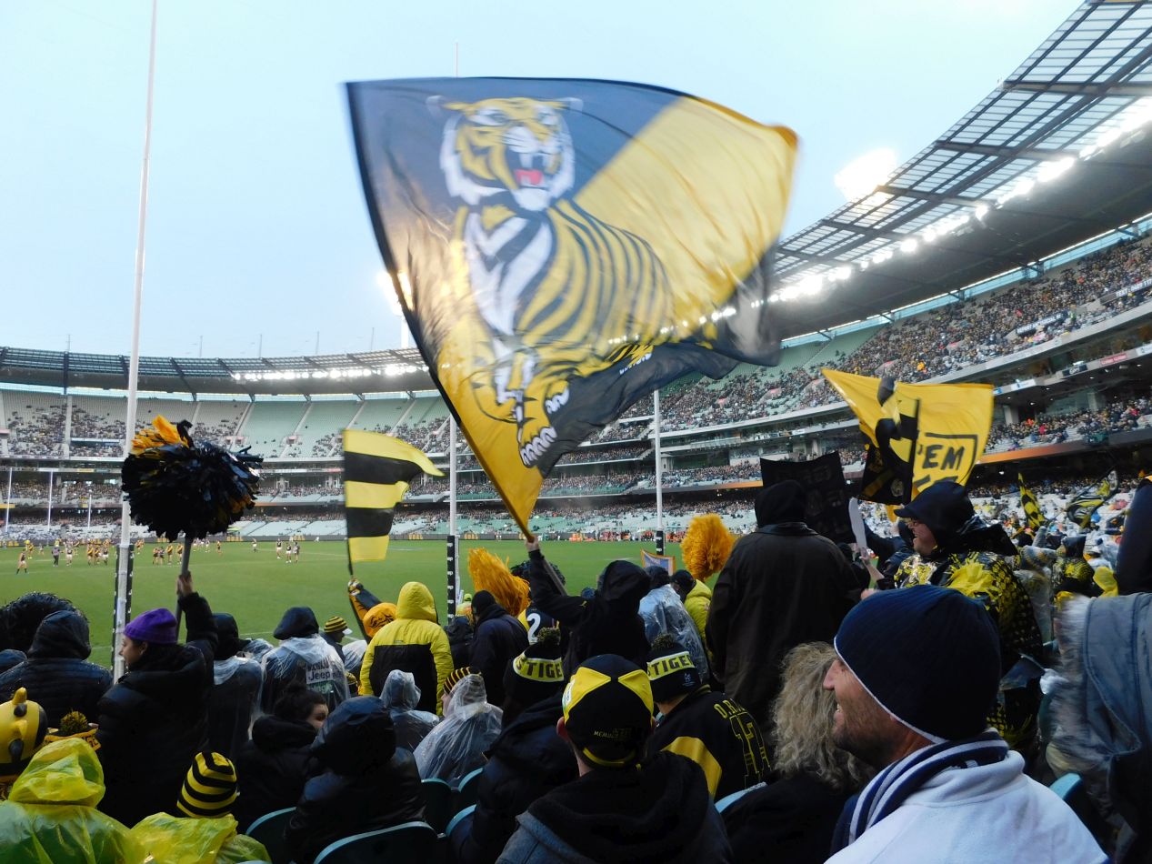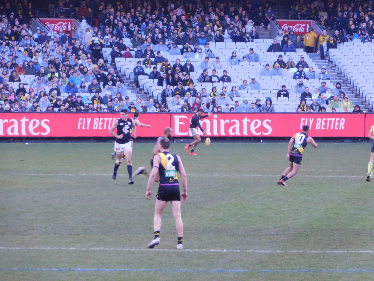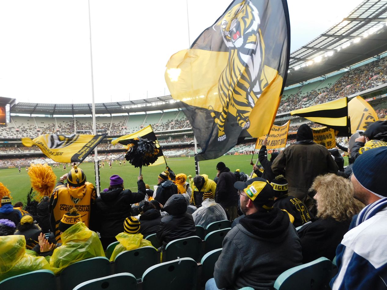 Then as far as the competitive nature of the match went, it also proved to be a letdown. We looked up the standings before the match and found that the Richmond Tigers were near the top of the table, coming into the day in fourth place. Meanwhile, although the Carlton Blues were an ancient and historic team, this was not one of their better seasons as they languished in 16th place. It was a mismatch on paper and proved to be a mismatch out on the pitch as well. Richmond scored early and often, amassing 6 goals in the first quarter and jumping out to a lead of 39-4. Even without knowing very much about Aussie football it was obvious that Richmond was the far superior side between these two opponents. We turned out to be seated in the Richmond fan section, and every time that the Tigers scored the people around us would break out into wild cheering and waving of huge flags. I suspect that the atmosphere would have been even better if so many fans hadn't stayed home due to the weather.