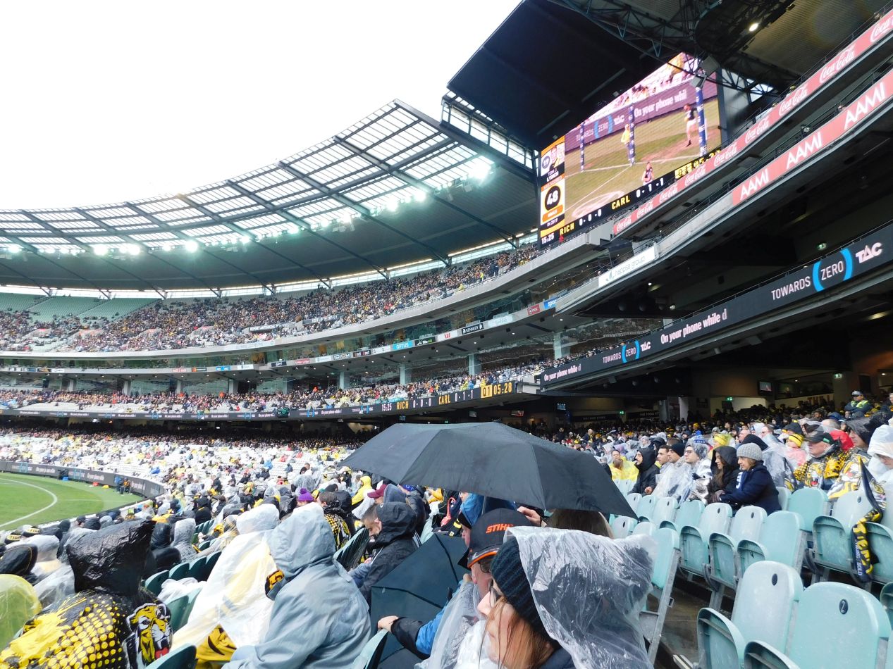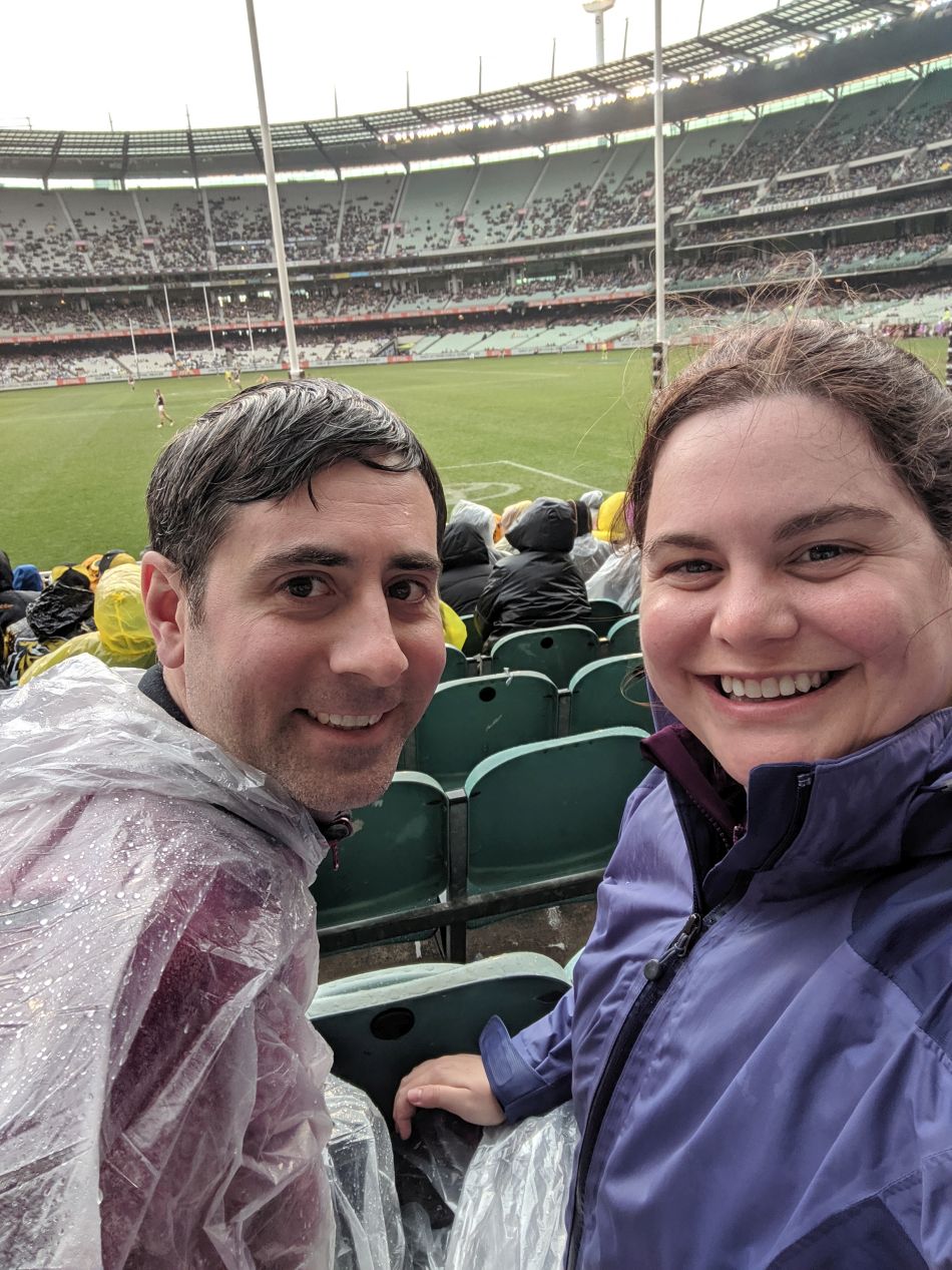 Here's the rain-soaked pair of us during the second half. Many thanks to Liz for picking up our rain ponchos to help keep off at least some of the water, along with a Carlton scarf for me to take home as a souvenir. We had decided before the game that I would root for Carlton due to their blue colors and Liz would root for Richmond due to their yellow colors, as befitting our respective Hogwarts houses (Ravenclaw and Hufflepuff). Liz had the last laugh here as Richmond won easily 73 (11.7) to 45 (6.9) in a match that wasn't as close as that score might suggest. This turned out to be a fantastic year for Richmond as they would win the 2019 AFL Grand Final six weeks later on the same pitch at the Melbourne Cricket Ground, destroying Greater Western Sydney by a score of 114 to 25 (17.12 to 3.7). Therefore we ended up getting to see the 2019 champion in the one and only Aussie football match that we went to see - not bad!