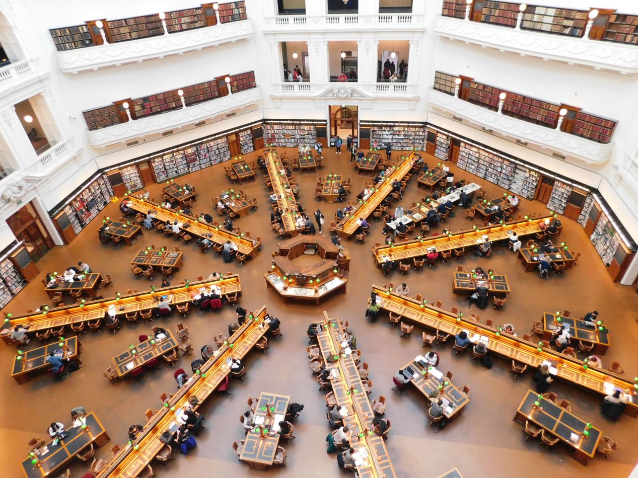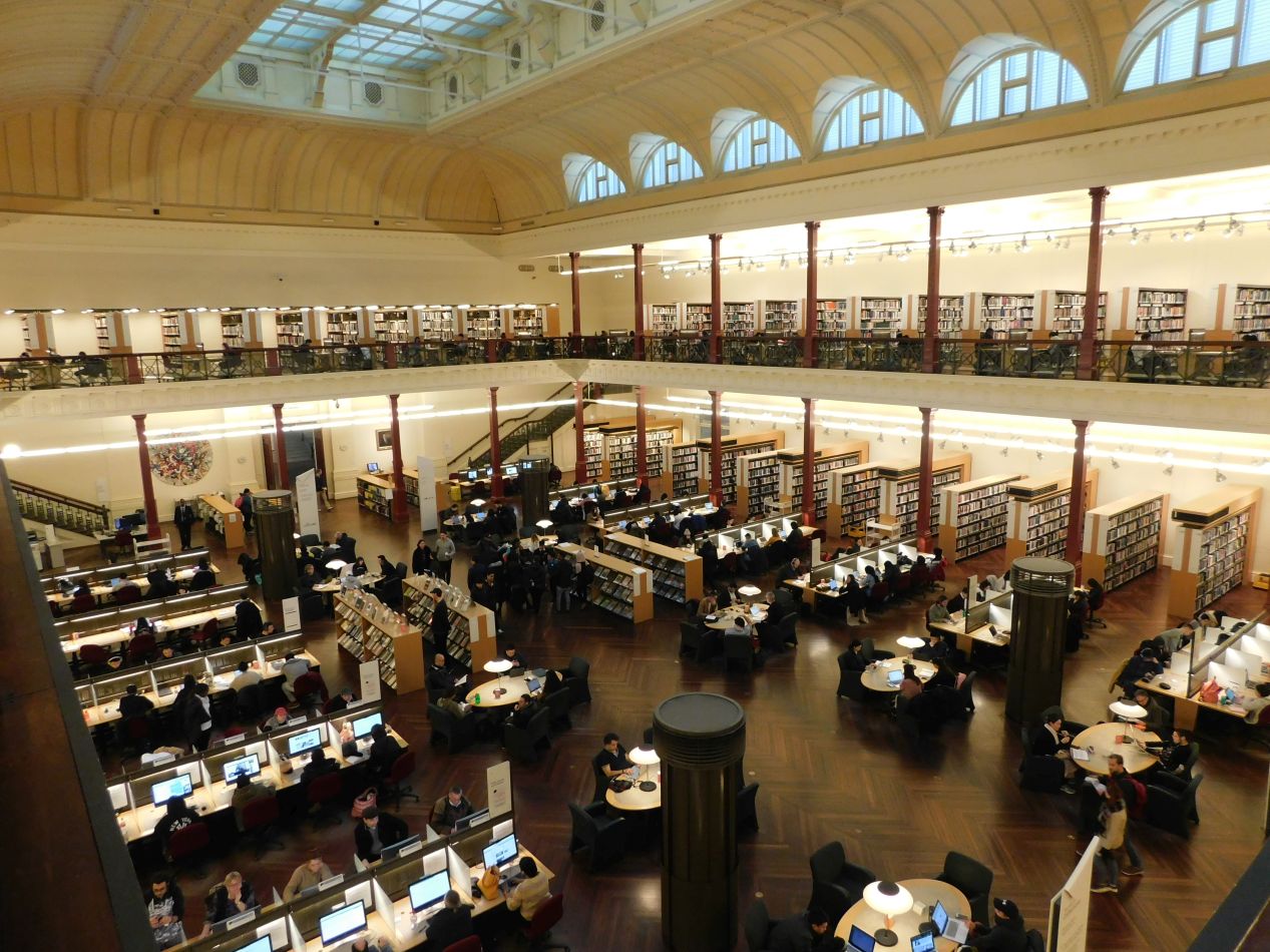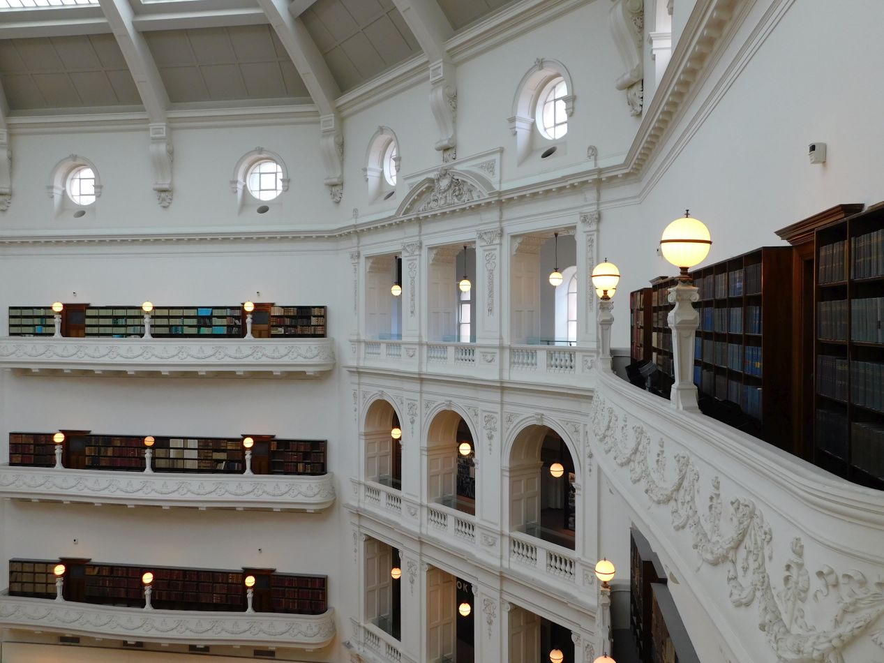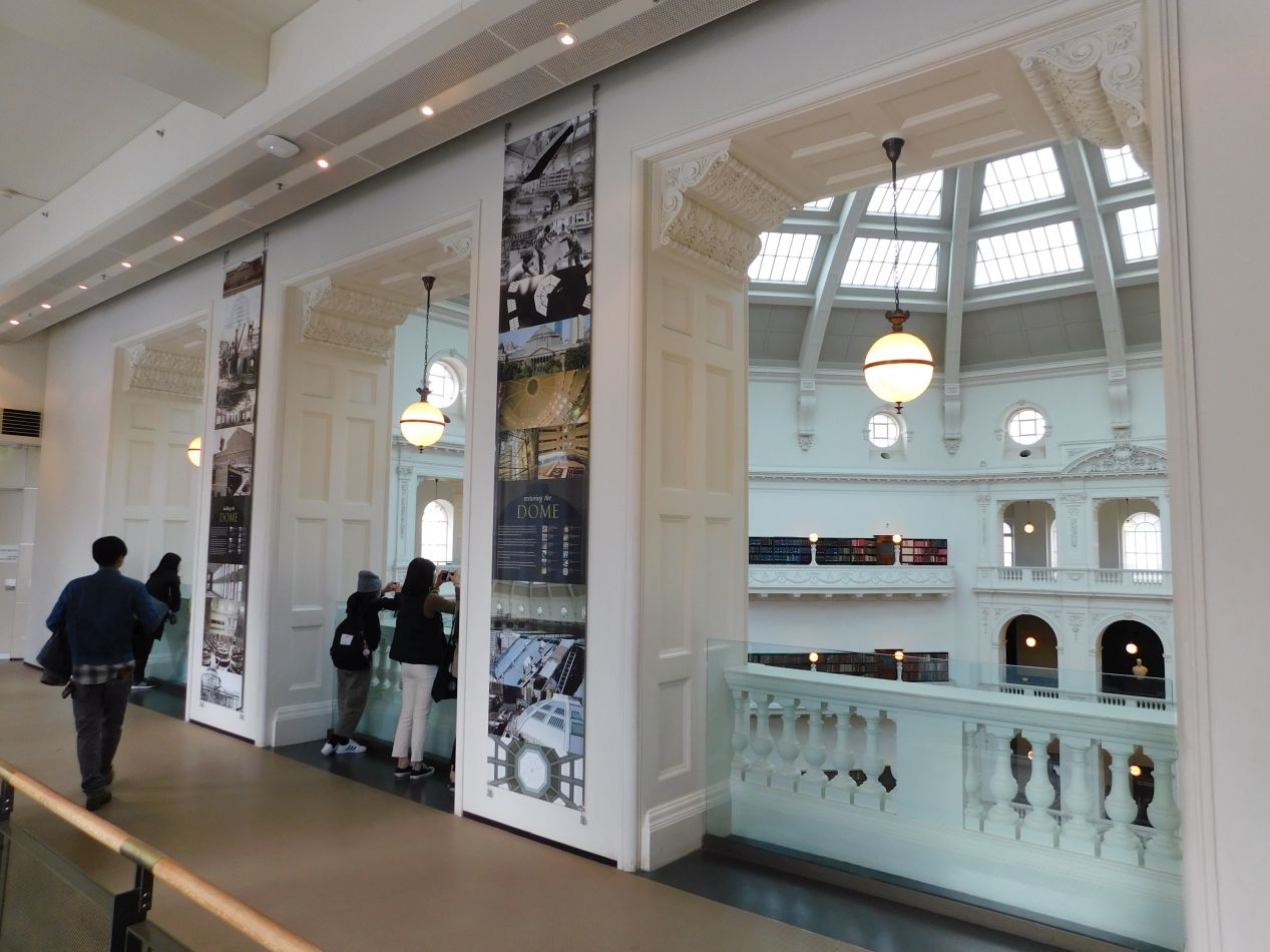 The true highlight of the State Library of Victoria was located in the center of the building, however. The landmark Domed Reading Room (recently renamed the LaTrobe Reading Room) was built in 1913 with a unique octogonal design. This reading room has the very unusual dimensions of being 35 meters wide and 35 meters tall (about 110 feet in both directions). It was originally designed to house as many as a million books but much of that space has been converted into museum exhibits; there was a history of early printing on display when we visited featuring a bunch of rare books. There were fewer people working in this reading room, perhaps because more tourists were popping in to take pictures, and the overall setup reminded me of the main reading room at the Library of Congress. There were stairs leading up to the top floor of the dome where I could get a better view and I headed off in that direction next.