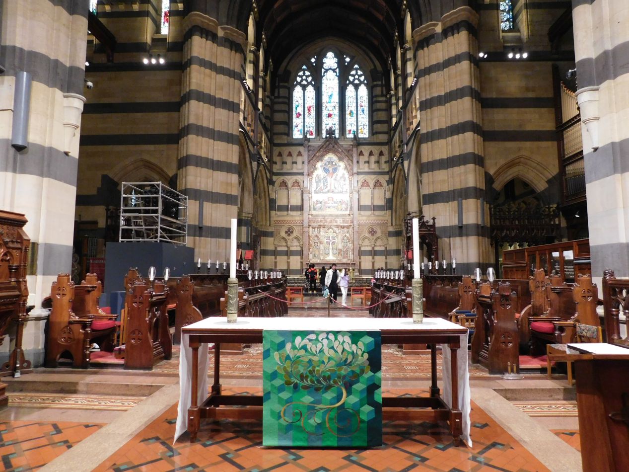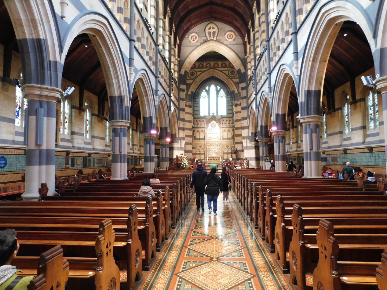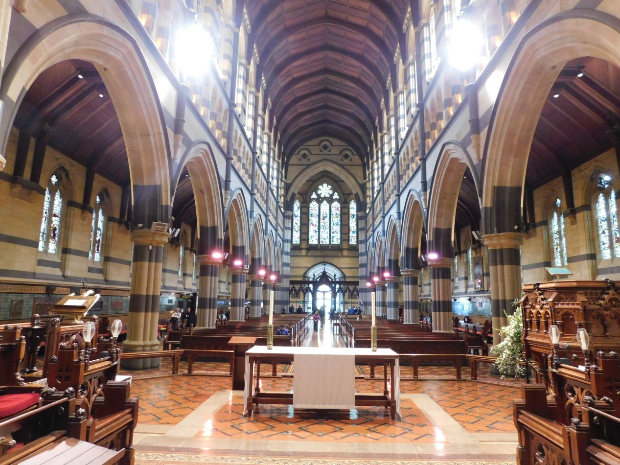 From the State Library of Victoria, we continued walking a few more blocks down Russell Street until reaching the collection of attractions in the heart of the downtown at Federation Square. The first location of interest that we stopped to see here was Saint Paul's Cathedral, an Anglican church that was constructed during the 1880s. Saint Paul's was home to the archbishop of Victoria, i.e. the highest-ranking Anglican individual in the state, and at the time of writing this was also the seat of the Primate of Australia, the top Anglican bishop in the whole country. In other words, this was a fairly important church that we were visiting. Saint Paul's was built in the very common Gothic Revival style of architecture, and although the form was pretty standard between its dual rows of stone pillars, arched ceiling, and stained glass windows on the exterior walls, Saint Paul's stood out from many other cathedrals due to its coloring. Saint Paul's was built using a mixture of sandstone and Victorian bluestone, with the two of them alternating in striped patterns that gave the church a very distinctive look. It was somewhat reminiscent of some Byzantine cathedral designs that I can recall seeing. We didn't stay here for very long and I appreciate Liz indulging my interest in religious architecture without too much eye-rolling.