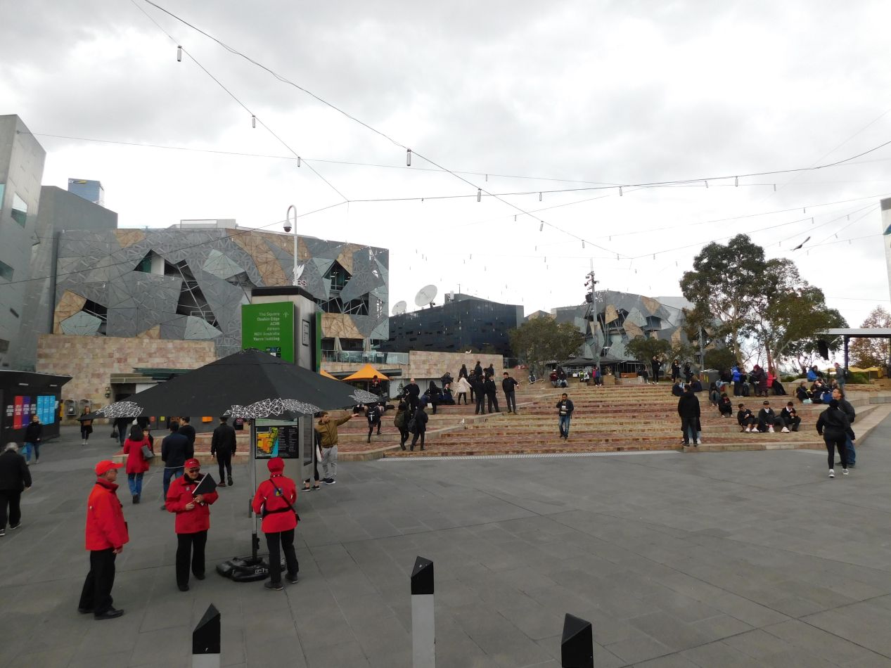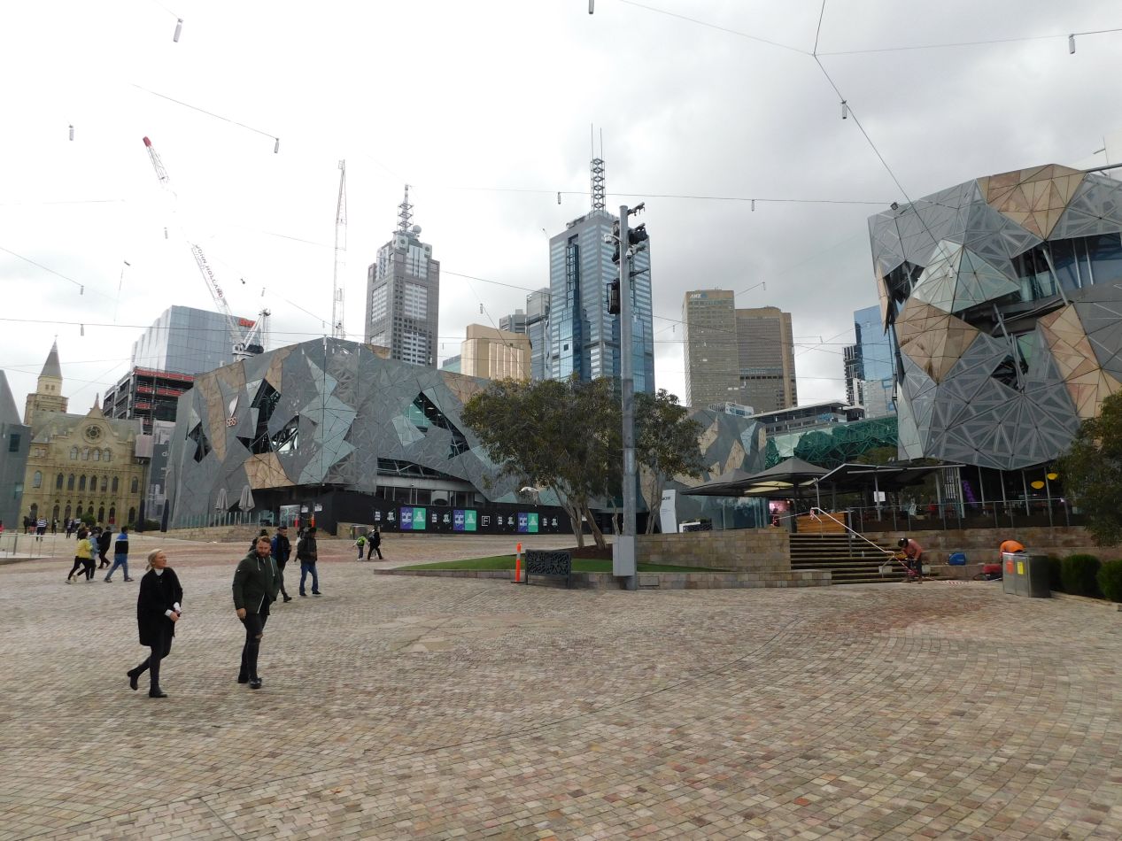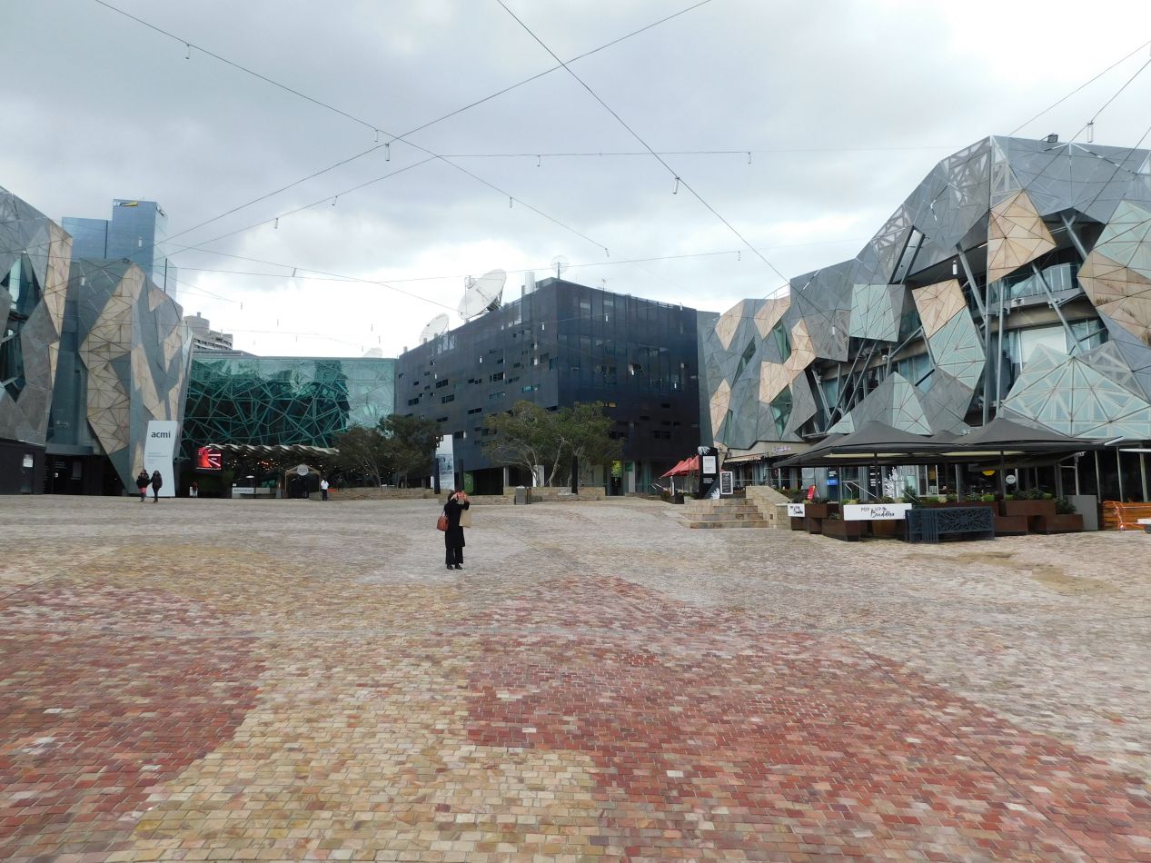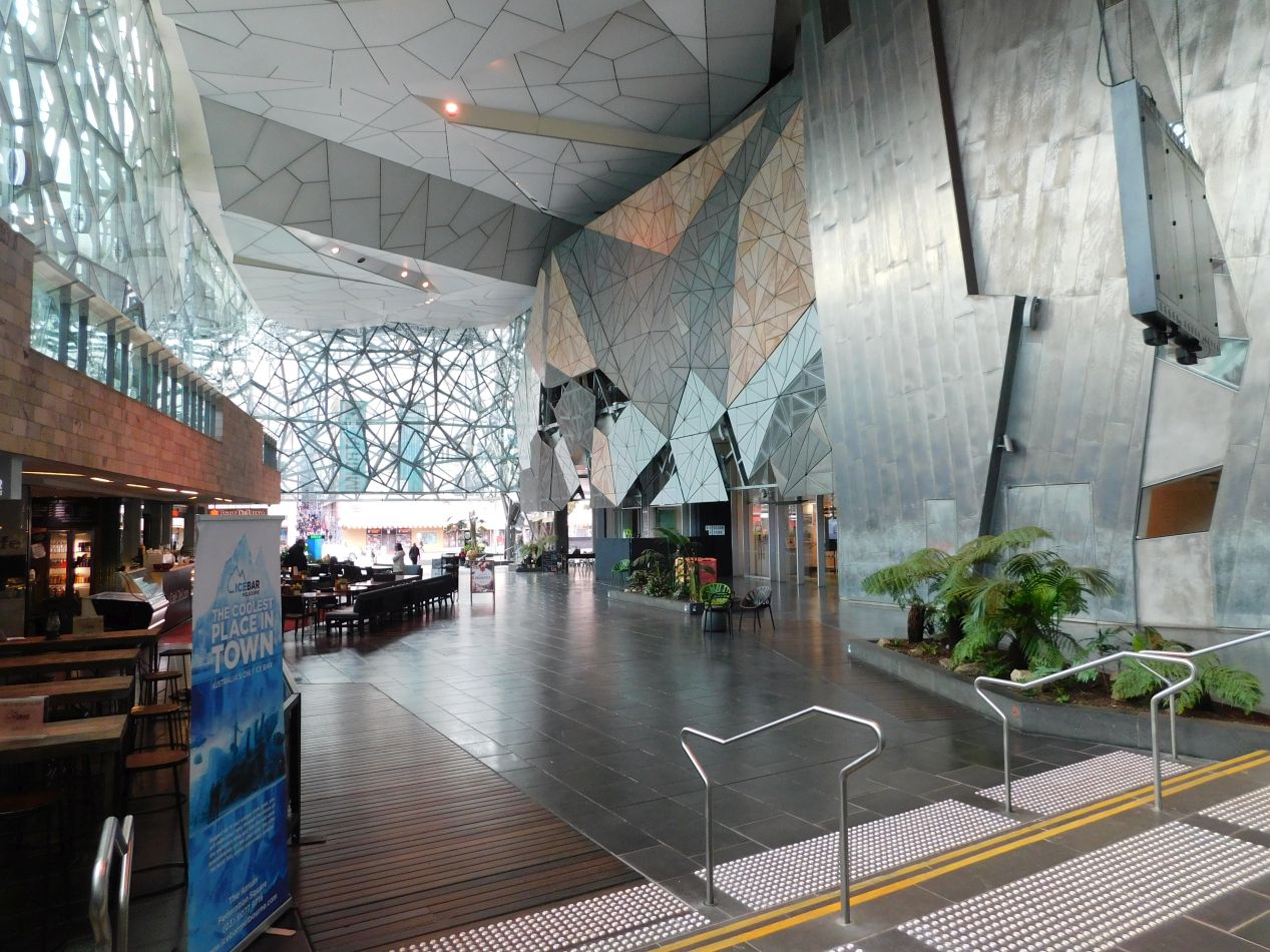 These are some images of the aforementioned Federation Square. Built in 2001 to commemorate the 100th anniversary of Australia's federal union, Federation Square is an outdoor venue for arts, cultural, and public events given choice real estate in the center of the downtown. In addition to serving as a public gathering space for the people of Melbourne, Federation Square also holds a series of restaurants and outdoor cafes along with the redesigned museum space for the National Gallery of Victoria. The architecture of Federation Square was based around the use of different "shards" that looked somewhat like cracked rocks mixed in with futuristic glass panels. I'm not entirely on board with this aesthetic but at least it does have a distinctive visual look. Our visit to Federation Square was marred somewhat by the weather, which chose this point in time to start raining once again, resulting in a square that was mostly empty of other people. We dodged the rain by stopping to eat lunch at one of the restaurants here, enjoying some hot pasta from a casual Italian spot.