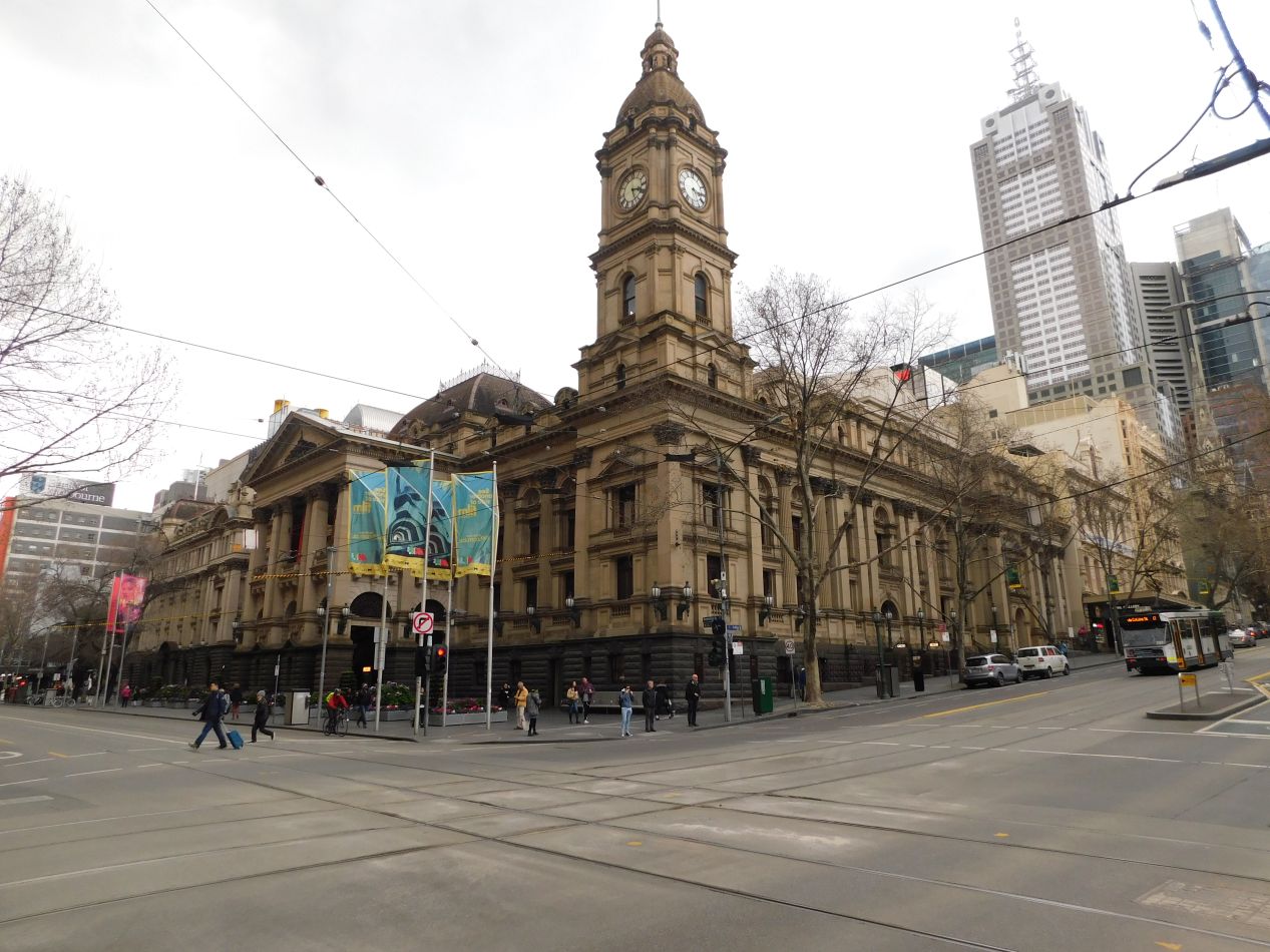 Here are some quick pictures that we took after stopping for lunch. The first is a view of the skyscrapers running along the south bank of the Yarra River, at a moment when the sun had decided to peek back out from behind the clouds. We looked into taking a tour boat along the Yarra for this evening but ultimately didn't have the spare time to make it happen. The other picture captures the historic Town Hall building in Melbourne with its distinctive clock tower. Dating back to 1867, this stately building continues to hold the civic government for the city and also hosts concerts and theatrical productions. I saw some of the pictures of this building from a hundred years earlier while putting together this report, and the town hall looks almost exactly the same now as it did then.