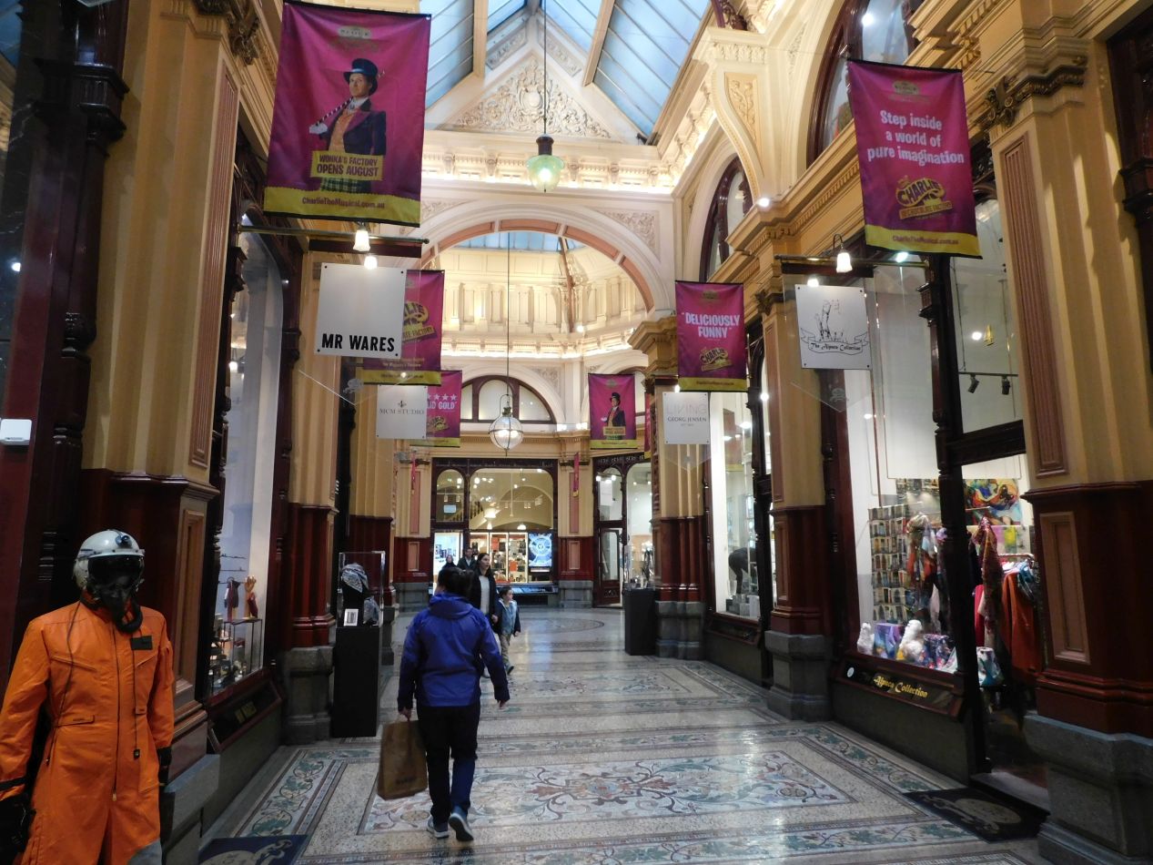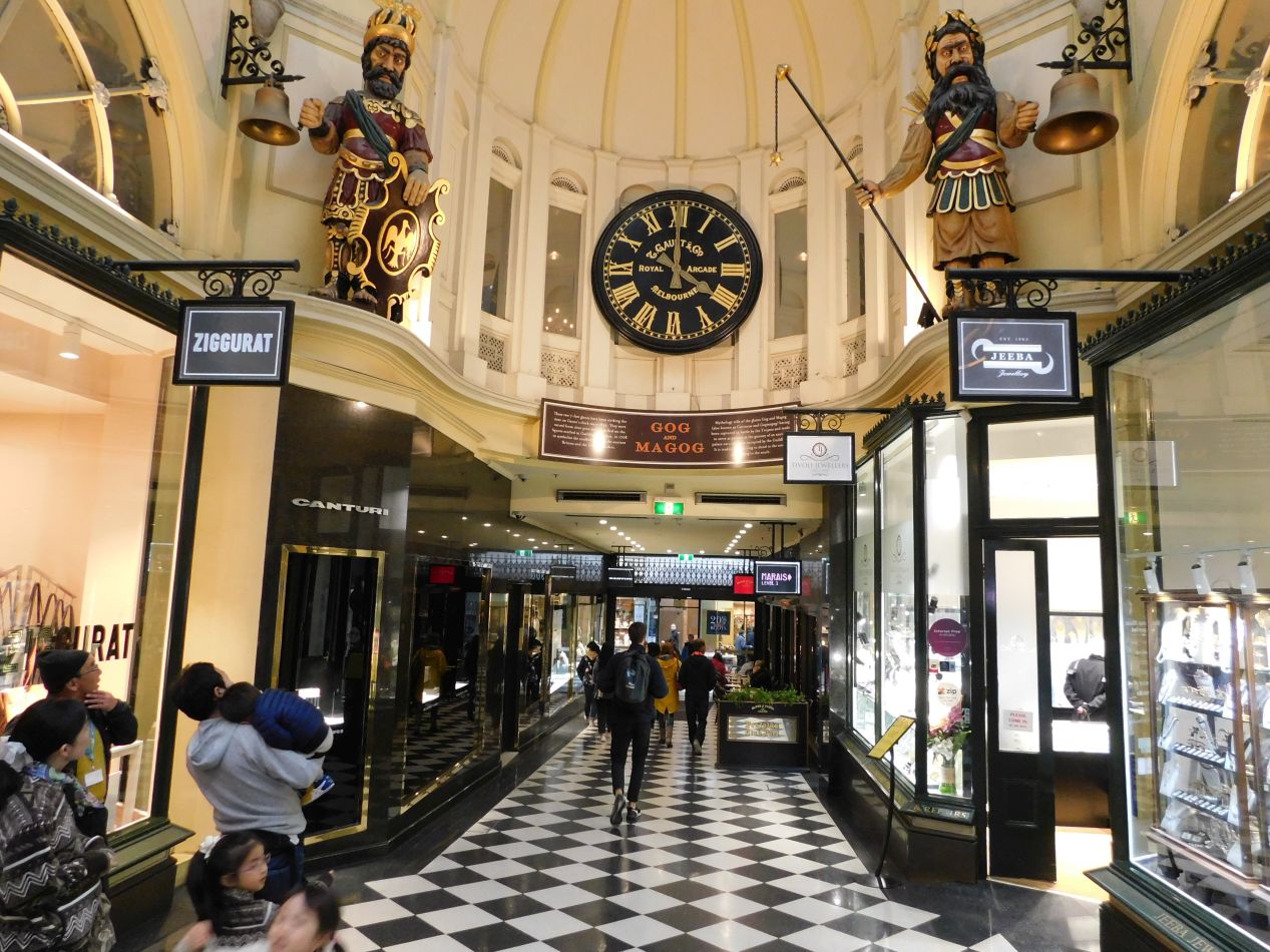 We spent a little while in the downtown area near Melbourne Town Hall exploring some of the shopping on display. This is the best part of the city to look for shopping, especially high end retailers, with many of them setting up for business in historic arcades that date back to the early 20th century. These places had names like "St. Collins Lane" and "The Walk Arcade" and "The Royal Arcade", indicating that they viewed themselves as a cut above your typical retail area. We enjoyed seeing the lavish food display set up at Hopetoun Tea Rooms, the delicacies sitting in the window at Haigh's Chocolates, and the offbeat store selling nothing but Dr. Seuss themed merchantise. One notably strange feature of one of these arcades was a pair of two statues named Gog and Magog, figures from Greek mythology that rang a series of bells each hour. We were passing through right at 4:00 PM and stopped to listen, then were severely underwhelmed at the rather pitiful sound that the statues made. They looked like they could have used a modern tune-up job. This was a pretty cool area to explore as far as shopping goes, lots of historic settings hosting modern sellers.