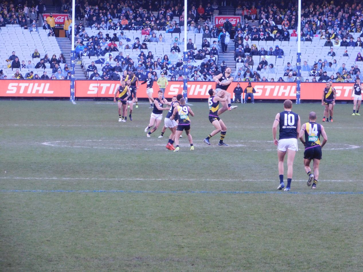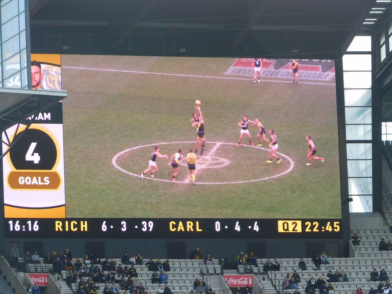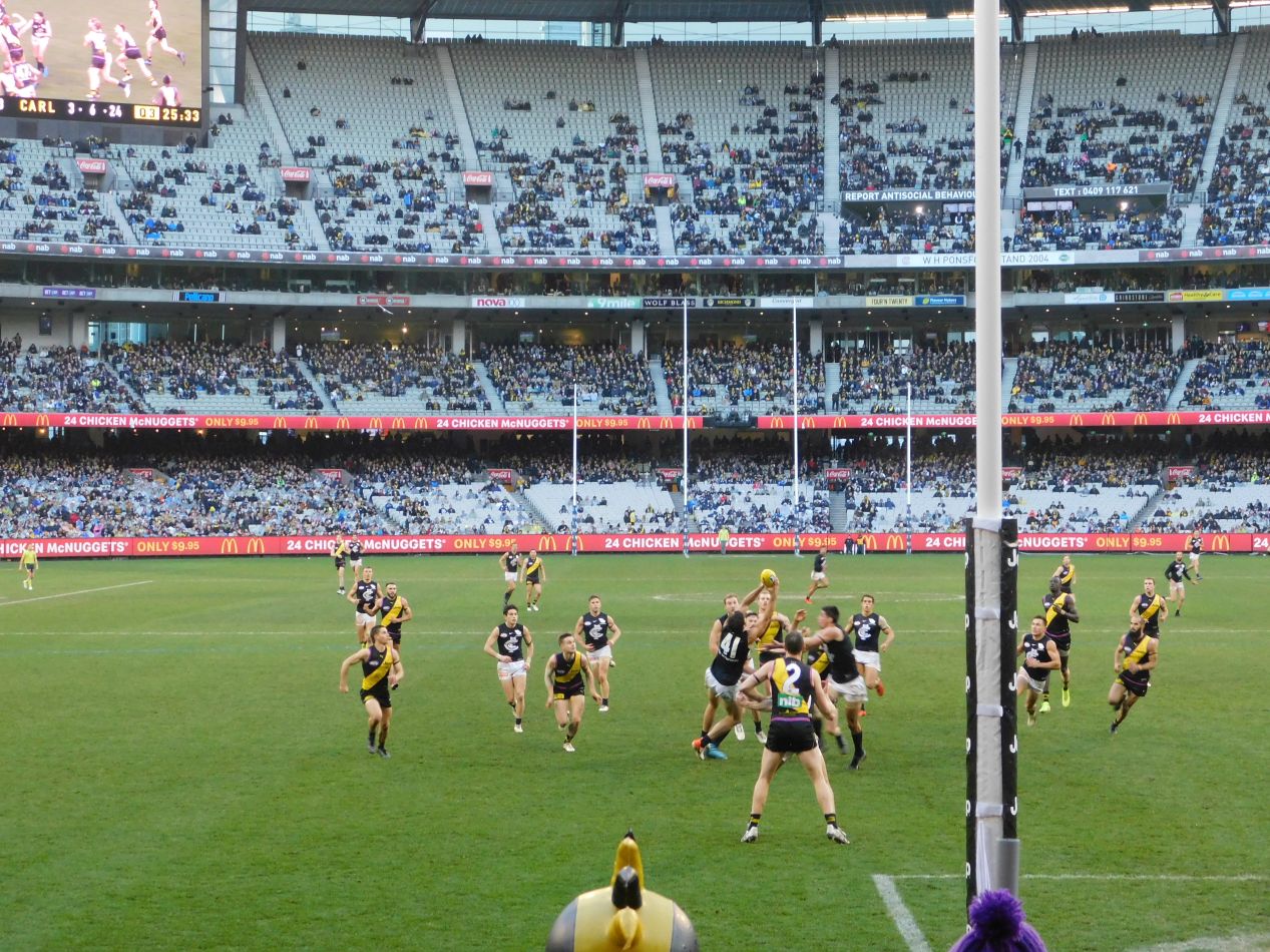 In practice, scoring in Aussie football tends to be dominated by free kicks. If a player managed to catch a ball that's been kicked more than 15 meters downfield, they are awarded a free kick from that spot, i.e. the chance to kick the ball without anyone from the other team having a chance to interfere. (There are also other ways to be awarded a free kick but this is the most common method.) The professional players have gotten very, very good at making goals off of free kicks from long distances away, and therefore the most common strategy involves kicking the ball downfield and having a really tall player jump up and make a contested catch in traffic near the other team's goal, then turn the subsequent free kick into a goal. Aussie football therefore makes for a fantastic spectator sport, combining the fast pace of action of a sport like soccer or rugby with the dramatic set piece suspense of a slower paced game like baseball. The tension in the air when someone needs to make a pressure free kick is just fantastic. My favorite goals in this match weren't from the free kicks, however, but the rarer ones scored in the run of play. There was one point in time where a Carlton player turned the ball over on their own side of the field, and the Richmond player who picked it up managed to kick the ball through the goalposts on the fly from about 30 meters away. Awesome, exciting stuff.