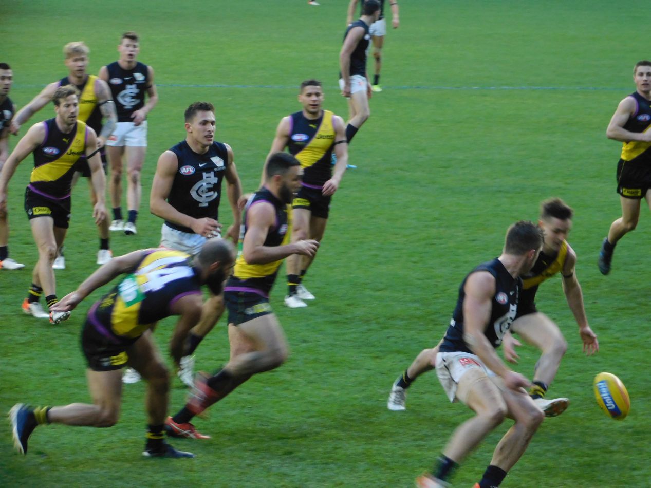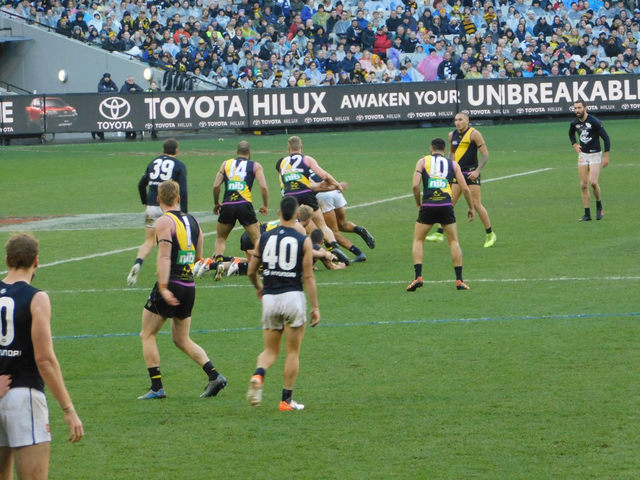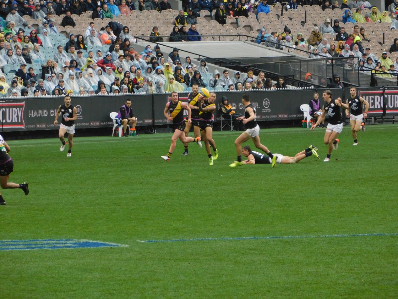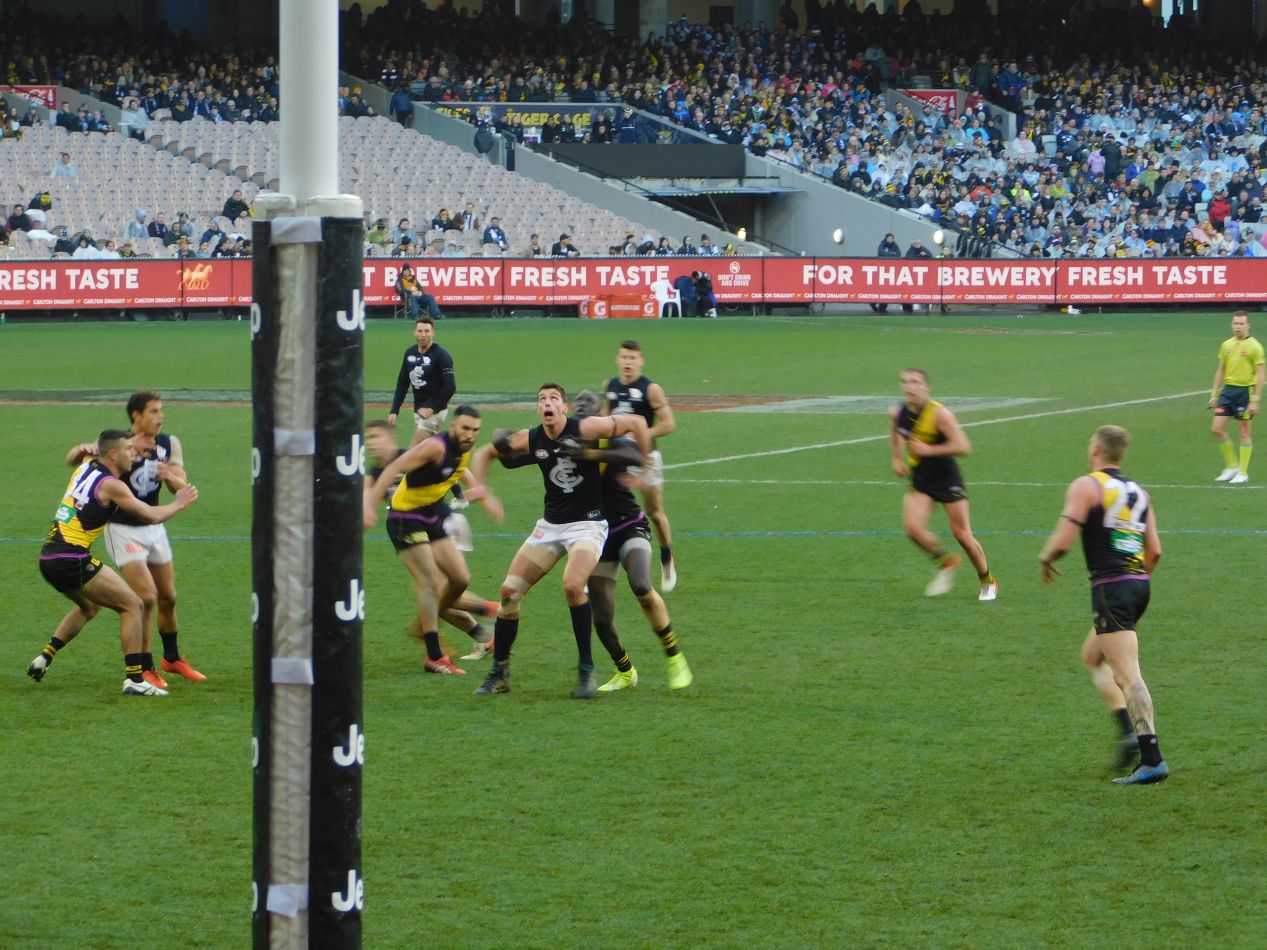In practice, scoring in Aussie football tends to be dominated by free kicks. If a player managed to catch a ball that's been kicked more than 15 meters downfield, they are awarded a free kick from that spot, i.e. the chance to kick the ball without anyone from the other team having a chance to interfere. (There are also other ways to be awarded a free kick but this is the most common method.) The professional players have gotten very, very good at making goals off of free kicks from long distances away, and therefore the most common strategy involves kicking the ball downfield and having a really tall player jump up and make a contested catch in traffic near the other team's goal, then turn the subsequent free kick into a goal. Aussie football therefore makes for a fantastic spectator sport, combining the fast pace of action of a sport like soccer or rugby with the dramatic set piece suspense of a slower paced game like baseball. The tension in the air when someone needs to make a pressure free kick is just fantastic. My favorite goals in this match weren't from the free kicks, however, but the rarer ones scored in the run of play. There was one point in time where a Carlton player turned the ball over on their own side of the field, and the Richmond player who picked it up managed to kick the ball through the goalposts on the fly from about 30 meters away. Awesome, exciting stuff.