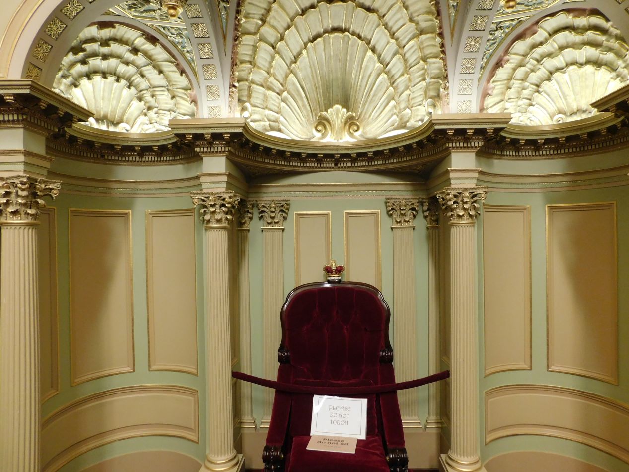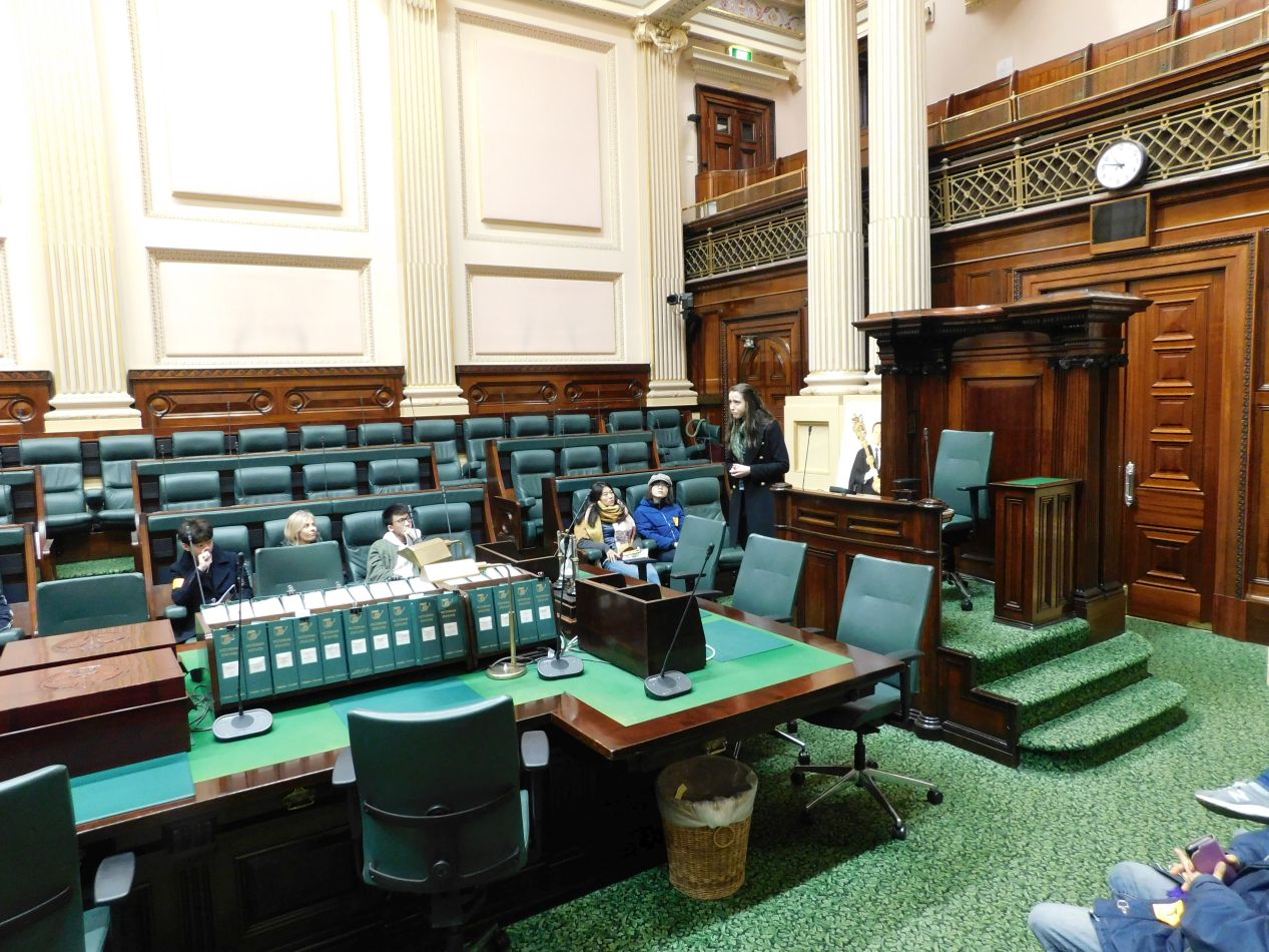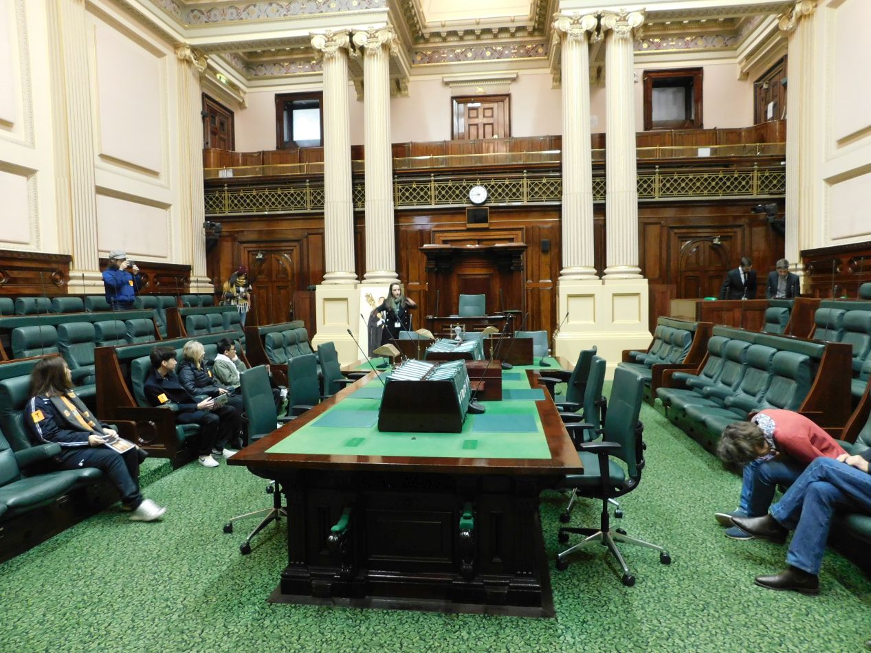 Our tour guide took us next to the Legislative Assembly chamber, the home to the lower house of Victoria's parliament. As we'd seen in other stops throughout Australia, the Legislative Assembly was the more important of the two houses of parliament, the place where nearly all legislation originates and the only body with the ability to raise taxes and spend from the public treasury. This was Victoria's local version of the British House of Commons, right down to the continued use of green for a color scheme (a pattern that apparently every parliament in Australia follows). Unlike some of our previous tours on this trip, the Legislative Assembly in Victoria had much more of a laid back feel to its tour, with our guide letting us sit right in the middle of the place and take the seats used by MPs. This was another place where the Neoclassical architecture of the building was evident, with more Greek columns holding up the ceiling around the edges of the room.