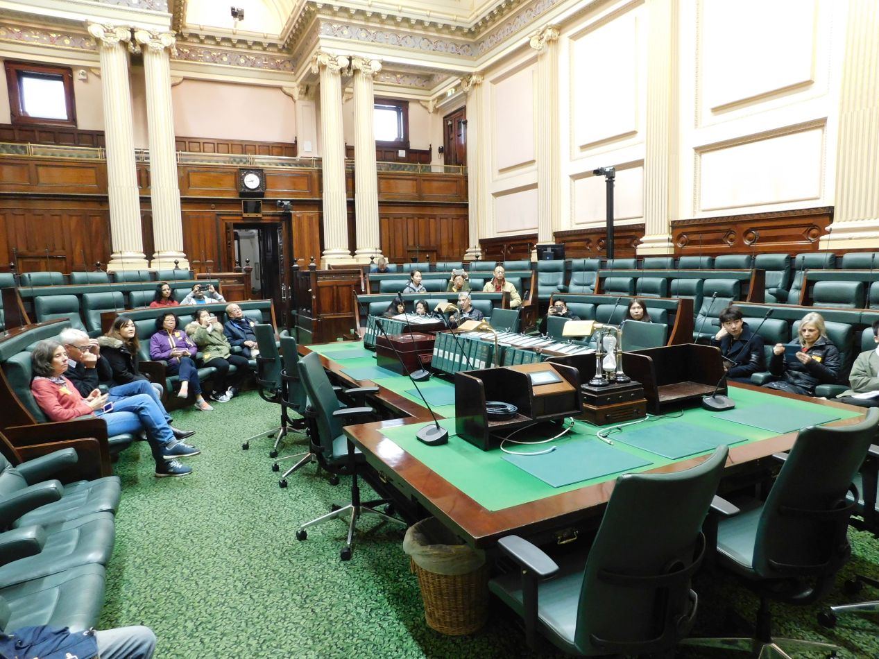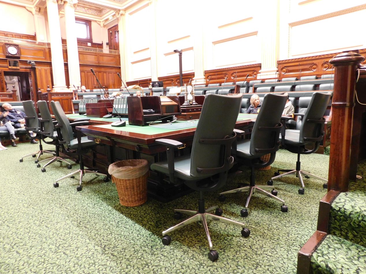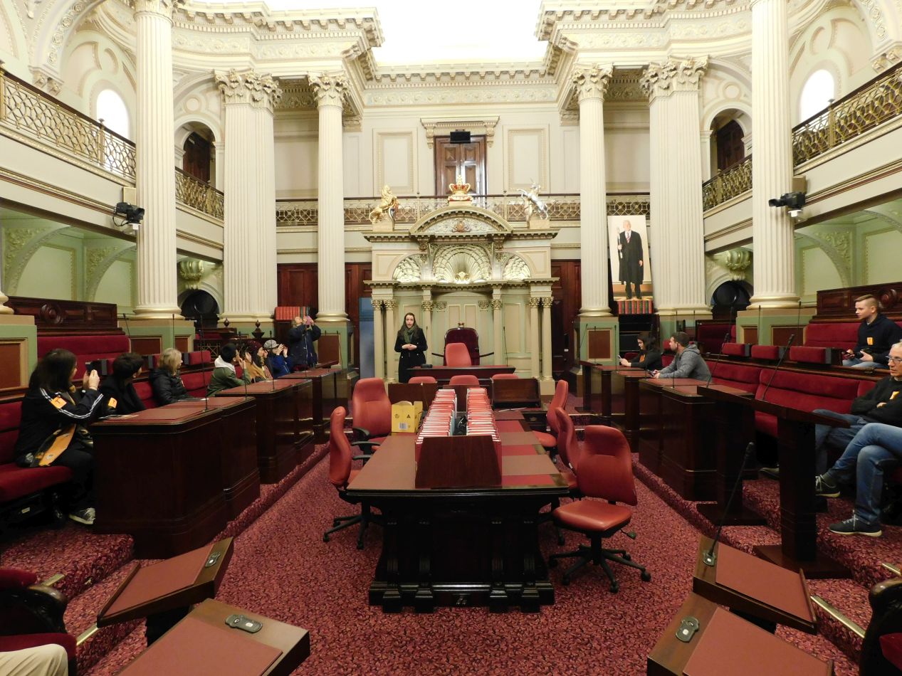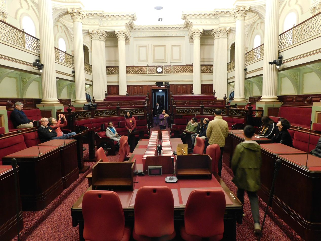 The obvious next stop on the tour was the upper house of the parliament, the Legislative Council. There were only 40 seats in the Legislative Council as opposed to 88 seats in the Legislative Assembly, and this body was most similar to the Australian Senate at the national parliament in Canberra that we had seen earlier, right down to the continued use of the red color scheme. Bills must pass both houses of the parliament to become law, and although legislation almost never starts in the upper house, it's not uncommon for amendments to be added in the Legislative Council as it acts as a review body. The voting system for the Legislative Council returns five members apiece for each of eight regions, and this unusual voting system results in various different minority parties gaining representation. At the time of this writing, the Victoria Legislative Council had a single sitting member from the Animal Justice party, the Reason party, the Transport Matters party, and something called the Shooters, Fishers, and Farmers party. I bet they have some interesting discussions when they get together to mark up a bill.