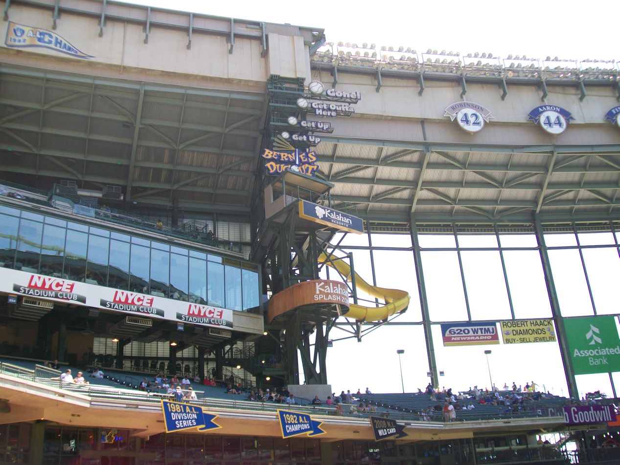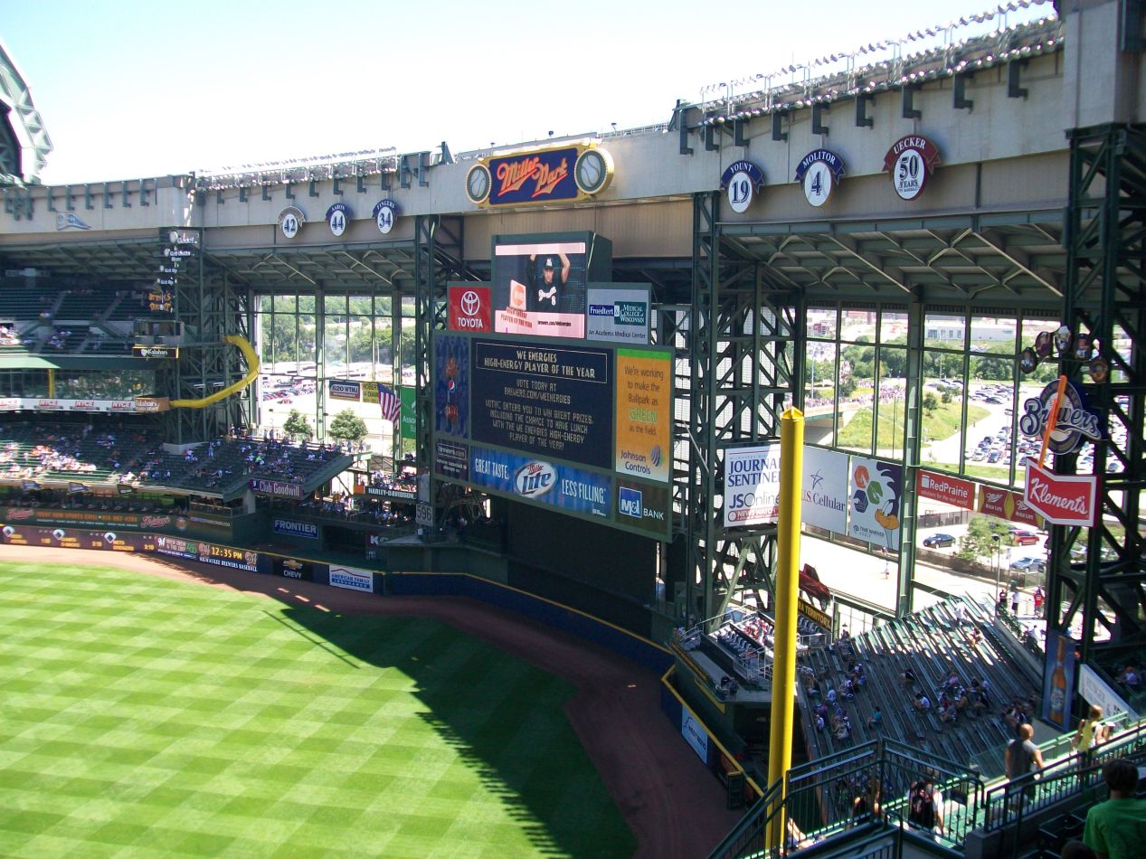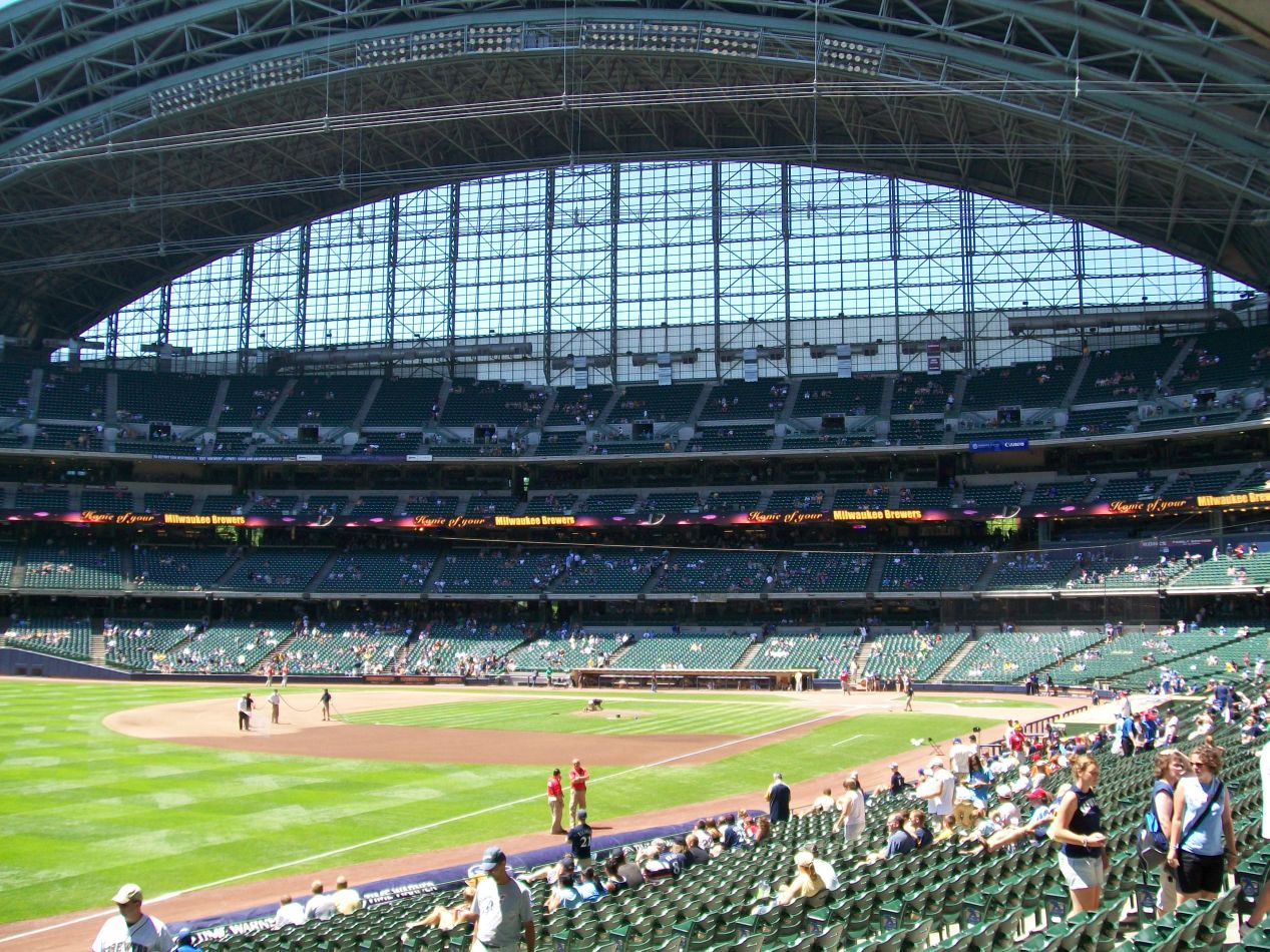 Miller Park (which will change to the much less cool name of American Family Insurance Park starting in 2021) opened during the 2001 season as a replacement for the old cookie-cutter Milwaukee County Stadium where the Brewers had originally played their home games. Miller Park's most noteworthy feature is a retractable roof that looks a bit like a fan from above, designed to compensate for Wisconsin's cool climate in the spring and fall seasons. This was a bright and sunny day, with the roof wide open above our heads. The stadium itself was simply enormous, and it felt larger than a traditional open stadium design due to the high walls that support the roof when closed. It was a little weird to be sitting in the upper deck with the roof extending upwards another hundred feet over our heads. Miller Park played host to the 2002 All Star Game shortly after it opened, a game that ignominiously ended in a tie and led to a decade of pure idiocy whereby the league that won the All Star Game was awarded home field advantage in the World Series. I also vividly recall that game taking place at the height of the steroid era, watching Barry Bonds and Sammy Sosa hitting 500 foot homeruns that actually hit the glass windows at the rear of the stadium on the fly. Entertaining stuff even if it wasn't entirely legitimate.