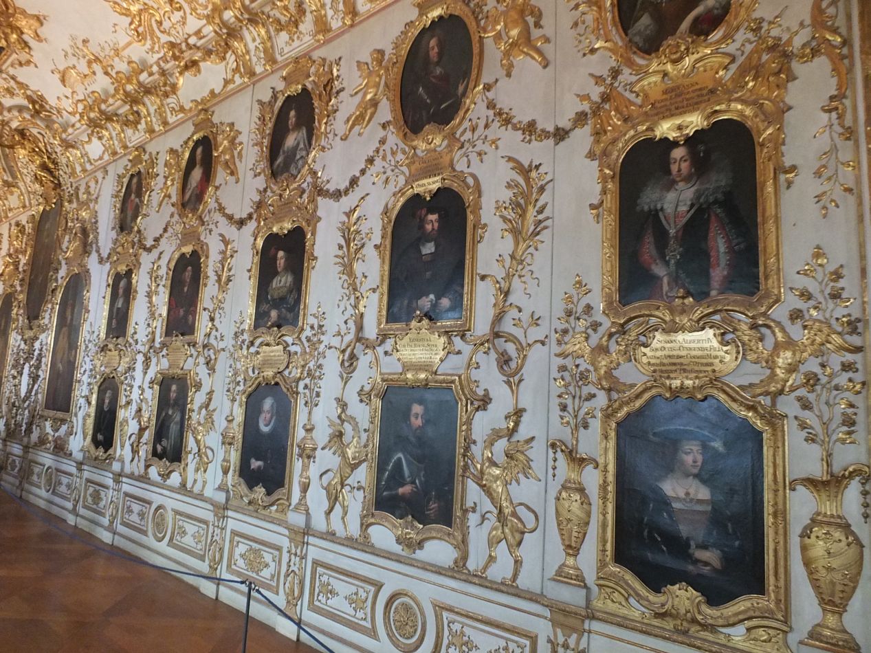 The same lack of restraint was on display in this series of rooms, known as the Ancestral Gallery. This section of the palace was constructed in the early 18th century, and instead of using Renaissance-inspired design, the architect decided to use the prevailing Baroque style in the gaudiest manner possible. The decorations here could fairly be described as Rococo, the term used for the late Baroque style that took frilly ornamentation to its limits. The Ancestral Gallery was full of portraits of different members of the Wittelsbach family, surrounded by fanciful creatures and twisting vines all made out of gold. In fact, the gold-worked ornamentation covered almost every bit of the walls and even expanded onto the ceiling when it ran out of space on the sides of the hallway. The opulence that was being flaunted here felt incredibly tacky to me; did the dukes of Bavaria really feel so insecure that they needed to surround their own portraits in a hallway of almost solid gold? Well, some of the later members of the family turned out to be genuinely insane (like "Mad King" Ludwig), so perhaps they were that insecure.