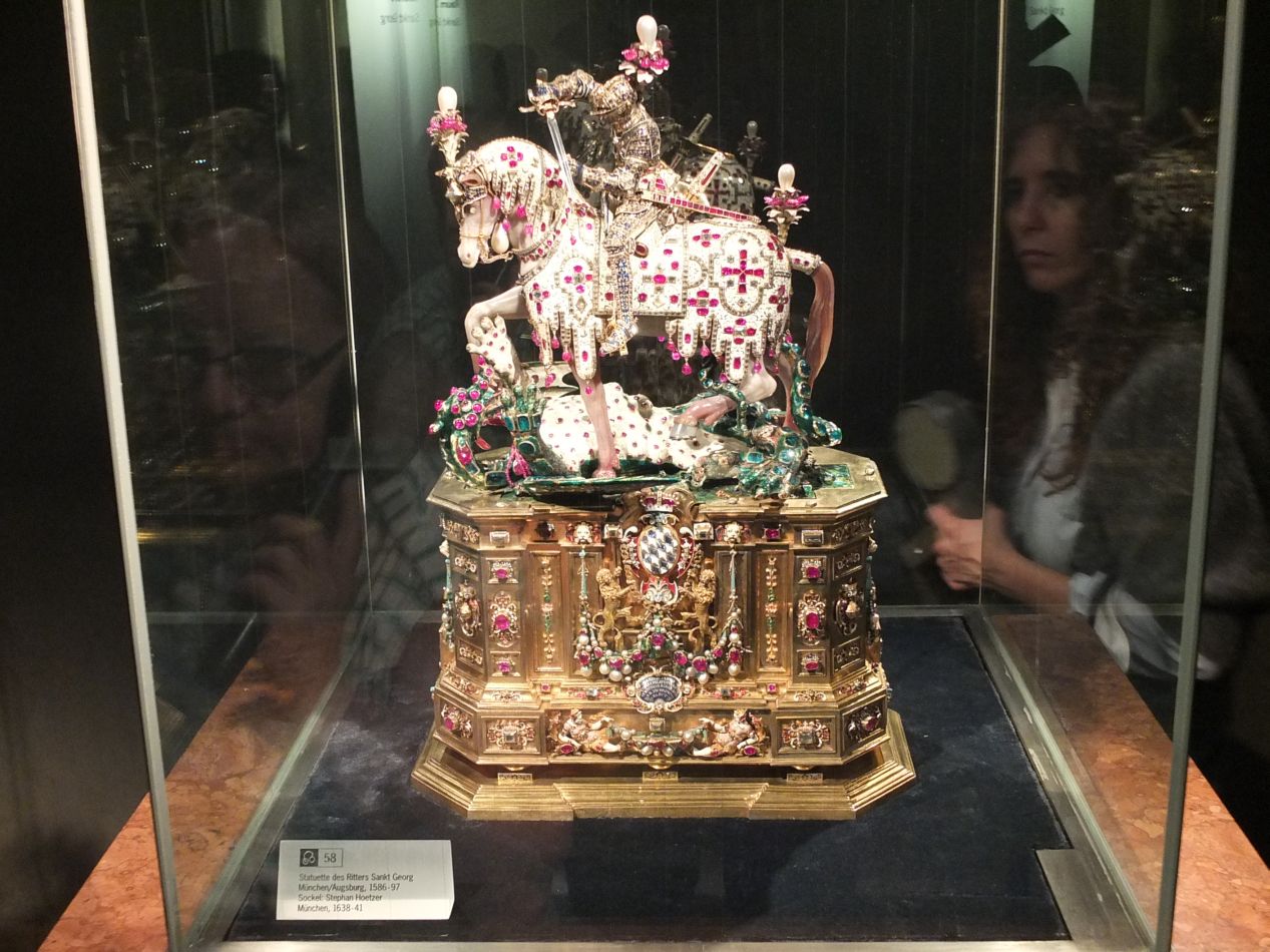 In addition to touring the rooms of the Residenz, visitors can also pay an additional fee to view the artifacts stored in the treasury. These were effectively the crown jewels of the Wittelsbach family, with the displays containing necklaces and earrings, swords and mitres, all made out of gold and precious gemstones. I counted at least five different crowns on display, with new ones made for each new royal coronation ceremony. As I'd noticed before, this reigning family was unashamed to showcase their wealth in the most conspicuous ways possible. I did find myself liking the little statue of a knight despite my better instincts, a depiction of St. George studded with little rubies all over the horse's barding. That was the one thing that I could see myself owning rather than immediately selling for whatever a purchaser would pay.
