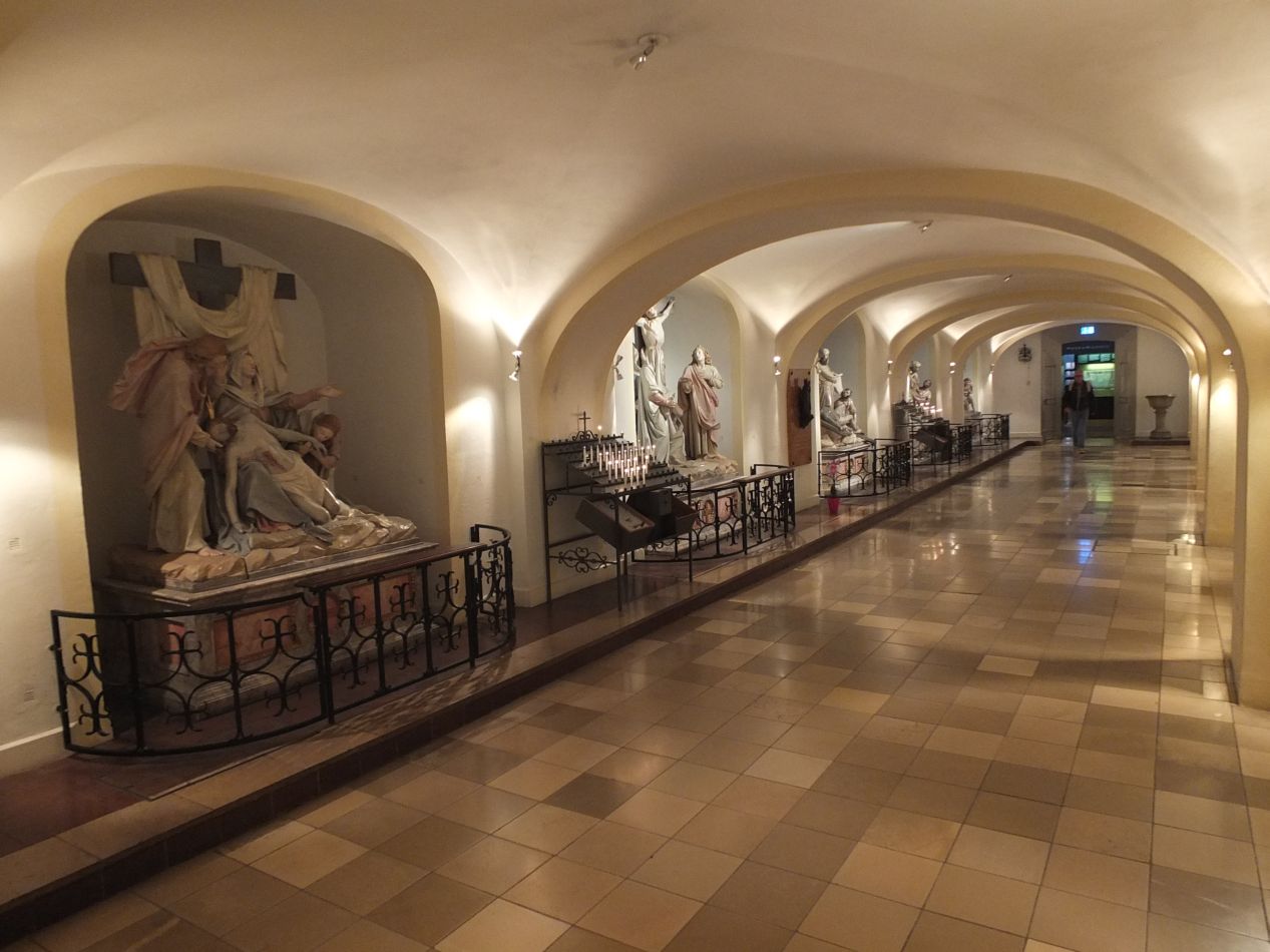 One of the first destinations that I came across was this church known as the Bürgersaalkirche ("Citizen's Hall" in English). Although this wasn't on my planned list of stops, it was right on the way and I popped inside for a few minutes. The Bürgersaalkirche was built during the 18th century for the use of a Marian congregation. The building was divided between an upper and lower floor, with visitors first entering the lower portion from the street outside. There was a small chapel here with the stations of the cross depicted in lifesized statues to either side. In the back, there was also a small museum with various religious artifacts owned by the church. On the upper level was the main church, a heavily gilded Baroque interior with an elaborately painted ceiling. This was a style of church design that I would be seeing repeatedly over the next few days, a different sort of setup than medieval High Gothic or the austere simplicity of some of the Calvinist churches. For a place that I hadn't intended to visit, this was a fun little stop.