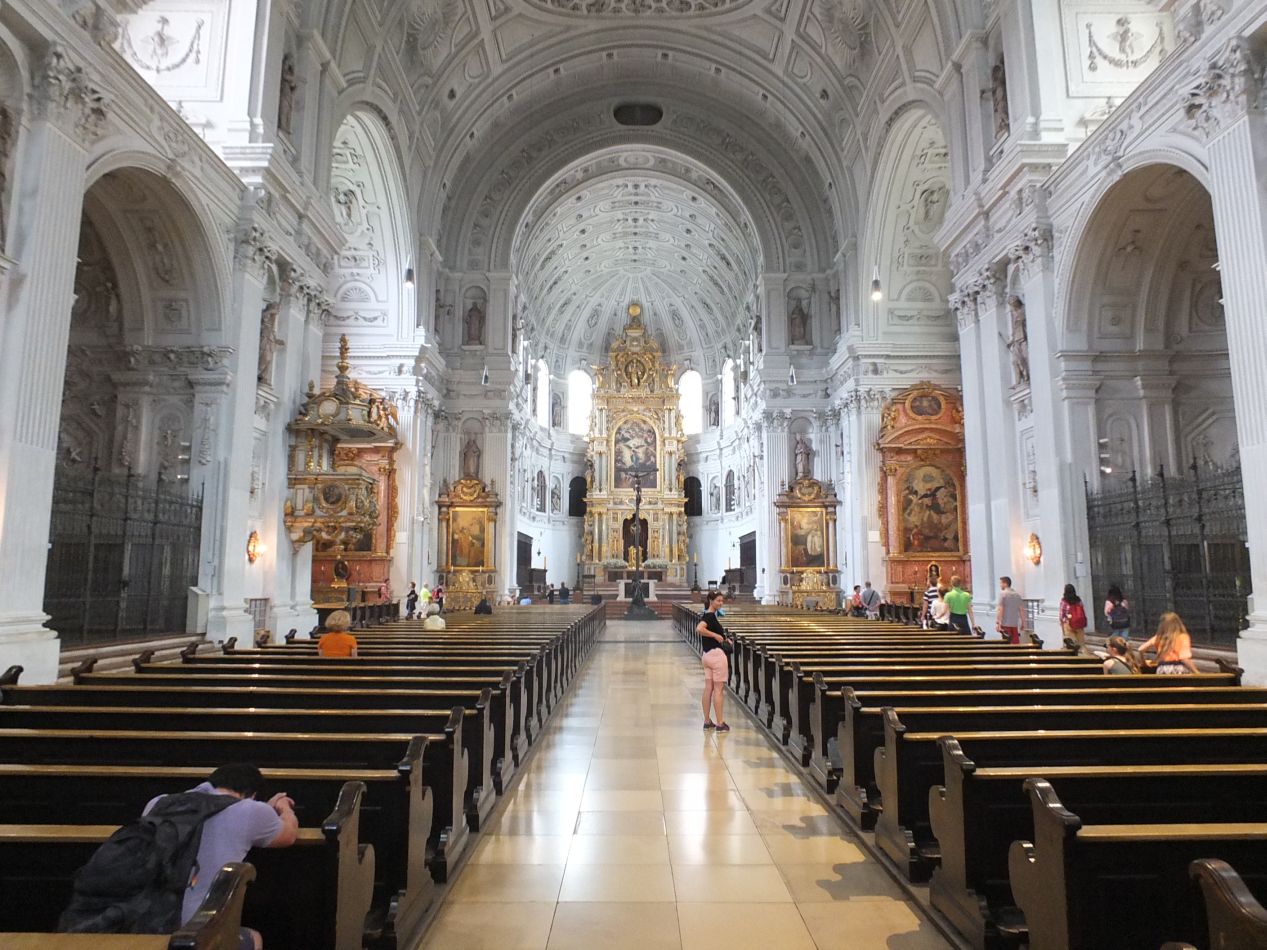 Only a short distance down the same main street was this larger church, St. Michael Kirche. I always have an affinity for churches that share my own name, and this one had a statue of the archangel stabbing Lucifer with a spear above the main entrance. The interior proved to be larger than the building looked from the street, with a very high ceiling providing an immediate contrast to the more intimate feel of the Bürgersaalkirche that I had just visited. This is the largest Renaissance church built north of Italy; it was constructed by the Jesuits to serve as a center for the Counter Reformation in the 16th century. Everything in the St. Michael Kirche seemed to be either white or gold, and the repeated use of arches was intended to serve as a sign of the triumph of Catholicism against its Protestant rivals. It was hard to avoid feeling at least somewhat impressed by the nature of this place. The overall effect seemed to be a bit over the top, trying to intimidate the visitor with its size and grandeur. I couldn't help but think of the old Dutch churches that I had visited in Delft and Amsterdam, which also used the same kind of white coloring but in a very different and simpler way. Those places never would have included these elaborate and enormous paintings surrounded by white and gold trim. At times, it felt like my trip was turning into a seminar on European religious architecture over the last thousand years.